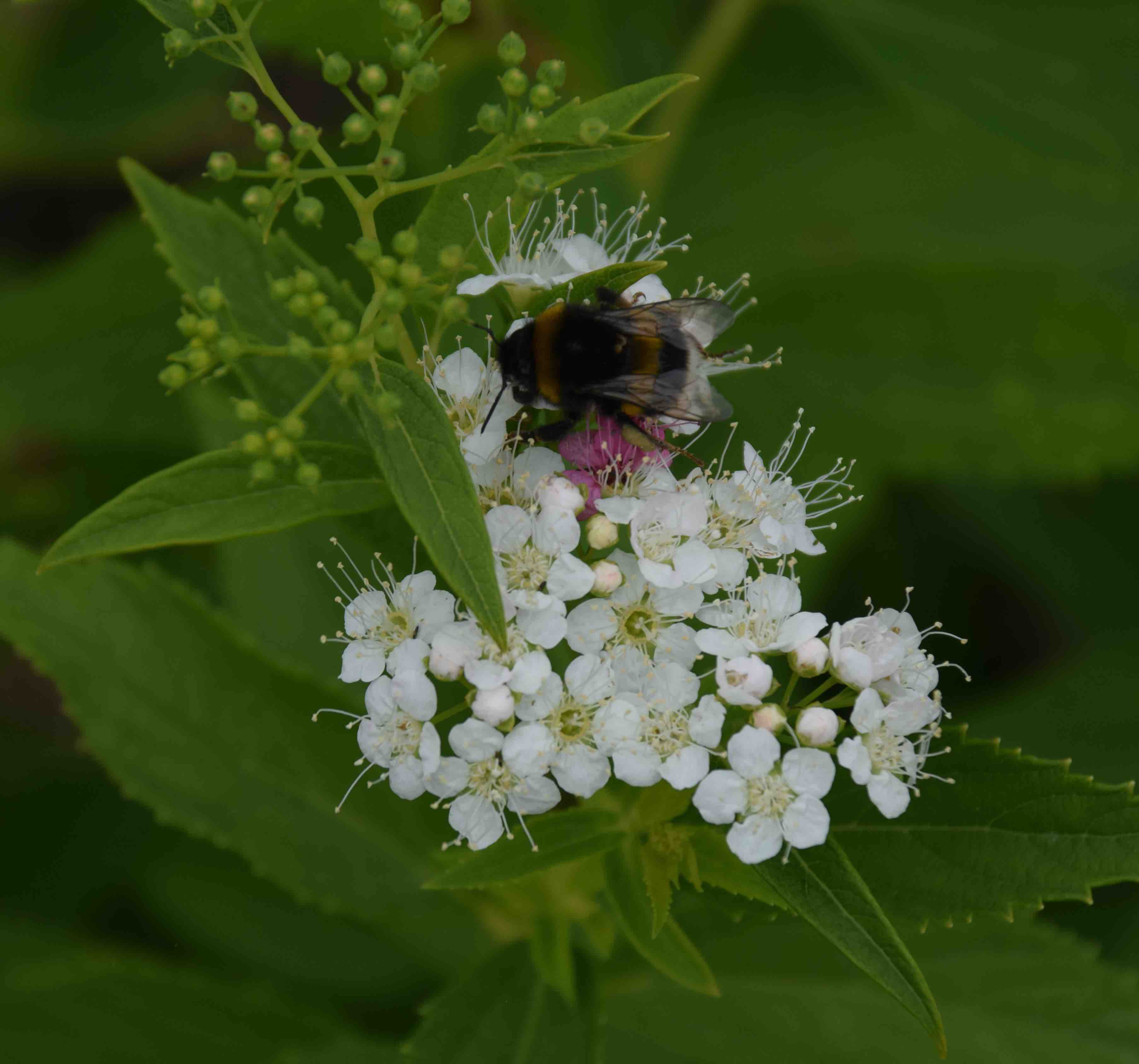 I noticed, this summer, that the bees loved the flowers but just ran over them, at speed, so perhaps they were collecting pollen rather than searching for nectar. The spiraea above is ‘Shirobana’ which is curious for having both white and pink flowers in each cluster but the bee is sitting on the pink flowers.