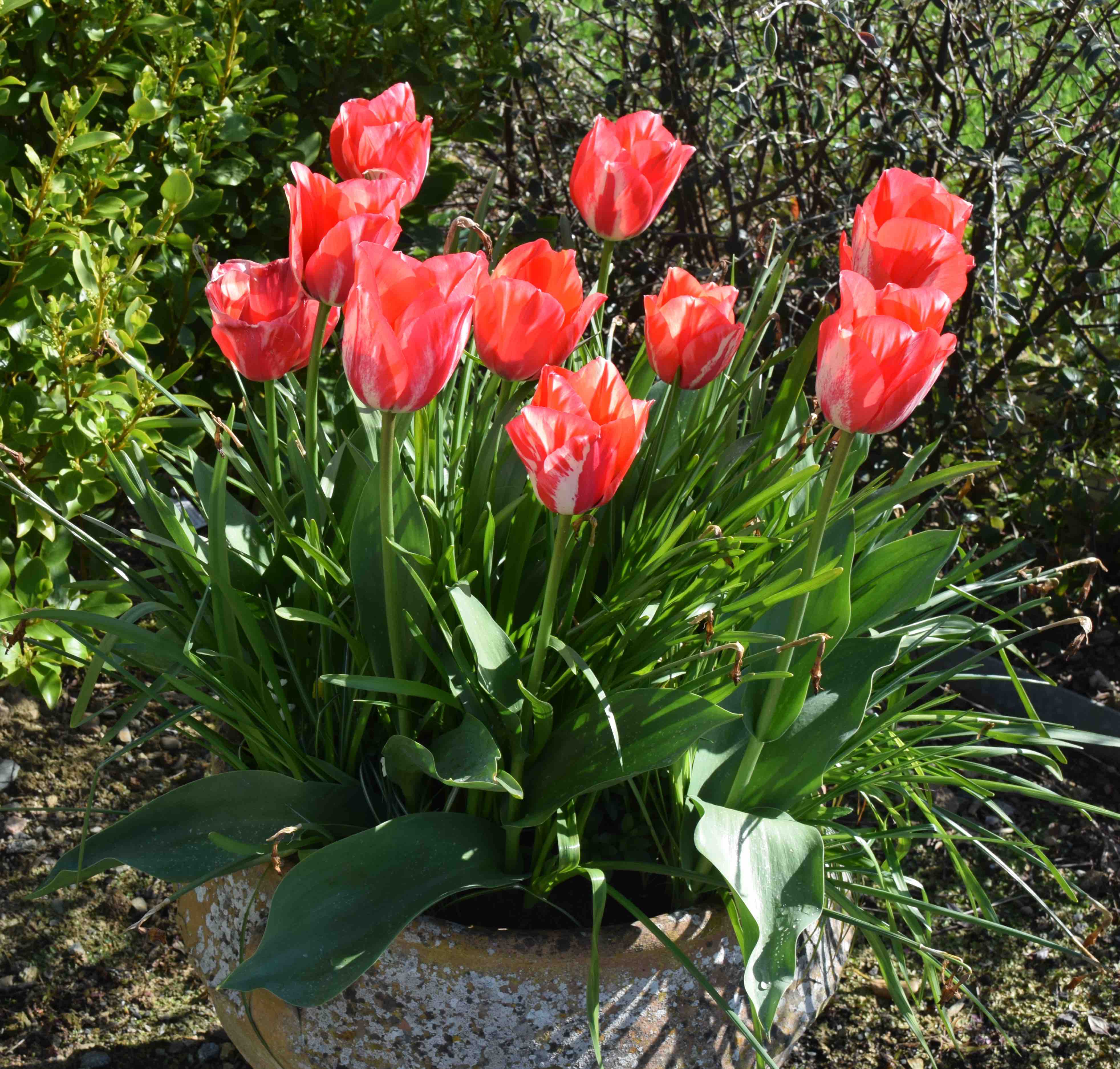 The tulips in this pot are in their second year. They were allowed to die back, lifted and dried and the largest bulbs replanted to give this display.
