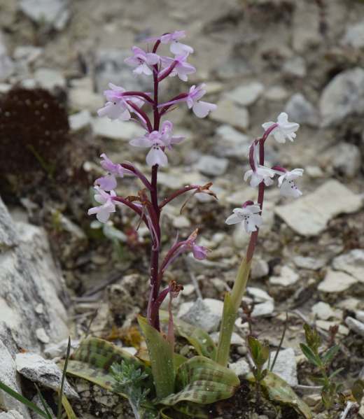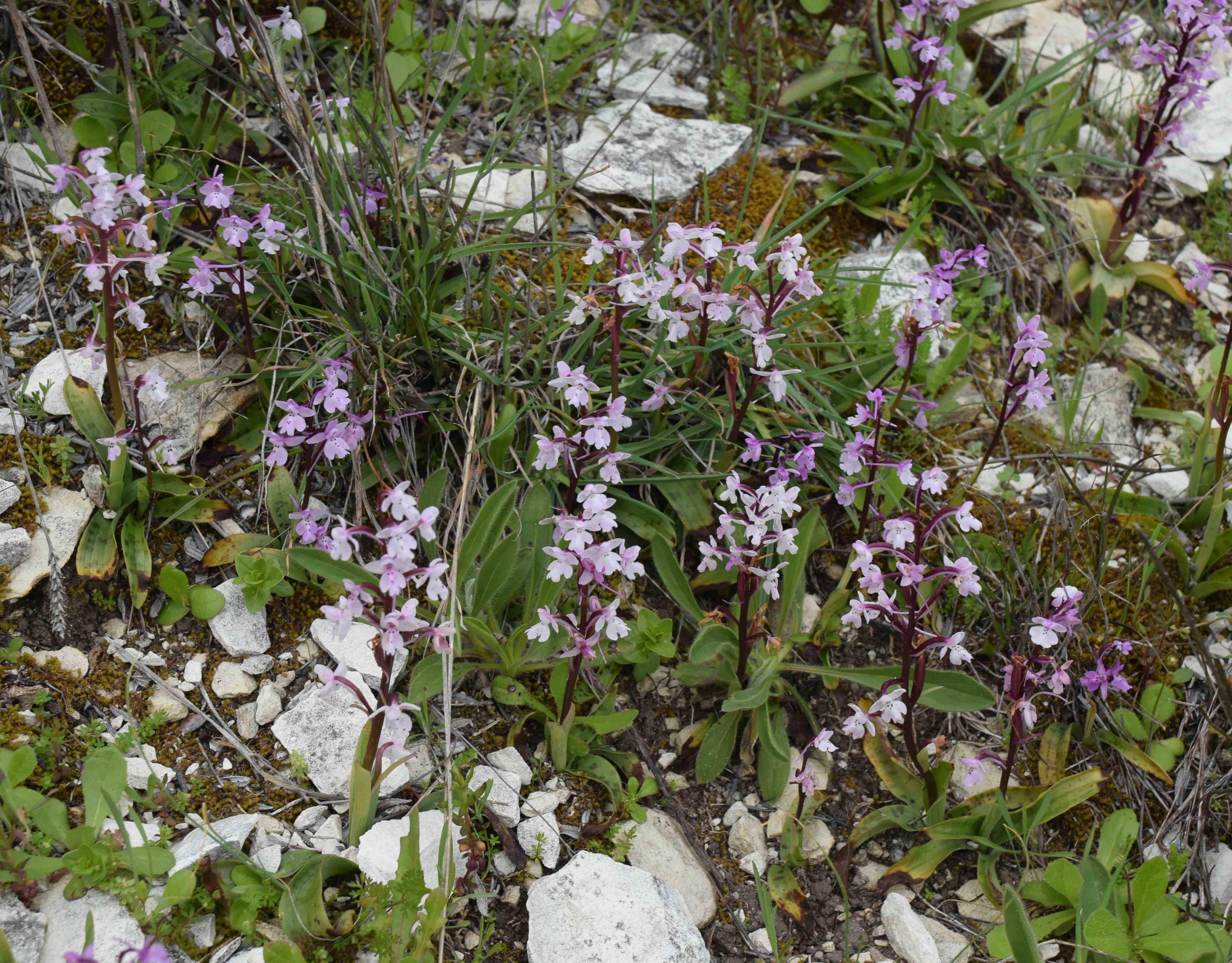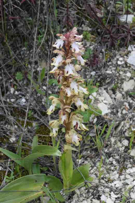The most striking, and possibly most common, of all the native orchids is Himantoglossum robertianum (sometimes called Barleria) and known as the giant orchid. It is certainly big and can grow to almost 1m high with broad, plain green basal foliage that is as robust as colchicum leaves. It grows on alkaline soils and often in part shade, beside bushes. Large in all its parts, it is a good marker of orchid habitat and whenever we stopped because we saw it, other orchids were always present. It tends to bloom earlier than many others so many of the plants I saw were past their best (in late March and early April).