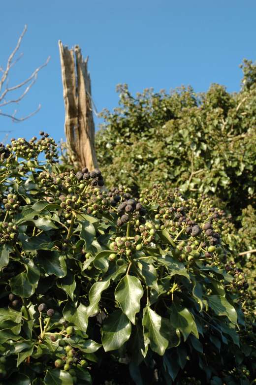 Ivy does not directly kill trees but it is often seen thriving on trees that are in decline. This is because ‘sick’ trees, with poor leaf cover, allow more light to get to the ivy and it will grow more quickly. A healthy canopy of tree leaves limits the vigour of the ivy. And when the tree dies, the ivy thrives, hoisted up into the light, and it will flower and berry freely. When the ivy gets big and bulky it will bring down dead branches as they rot.