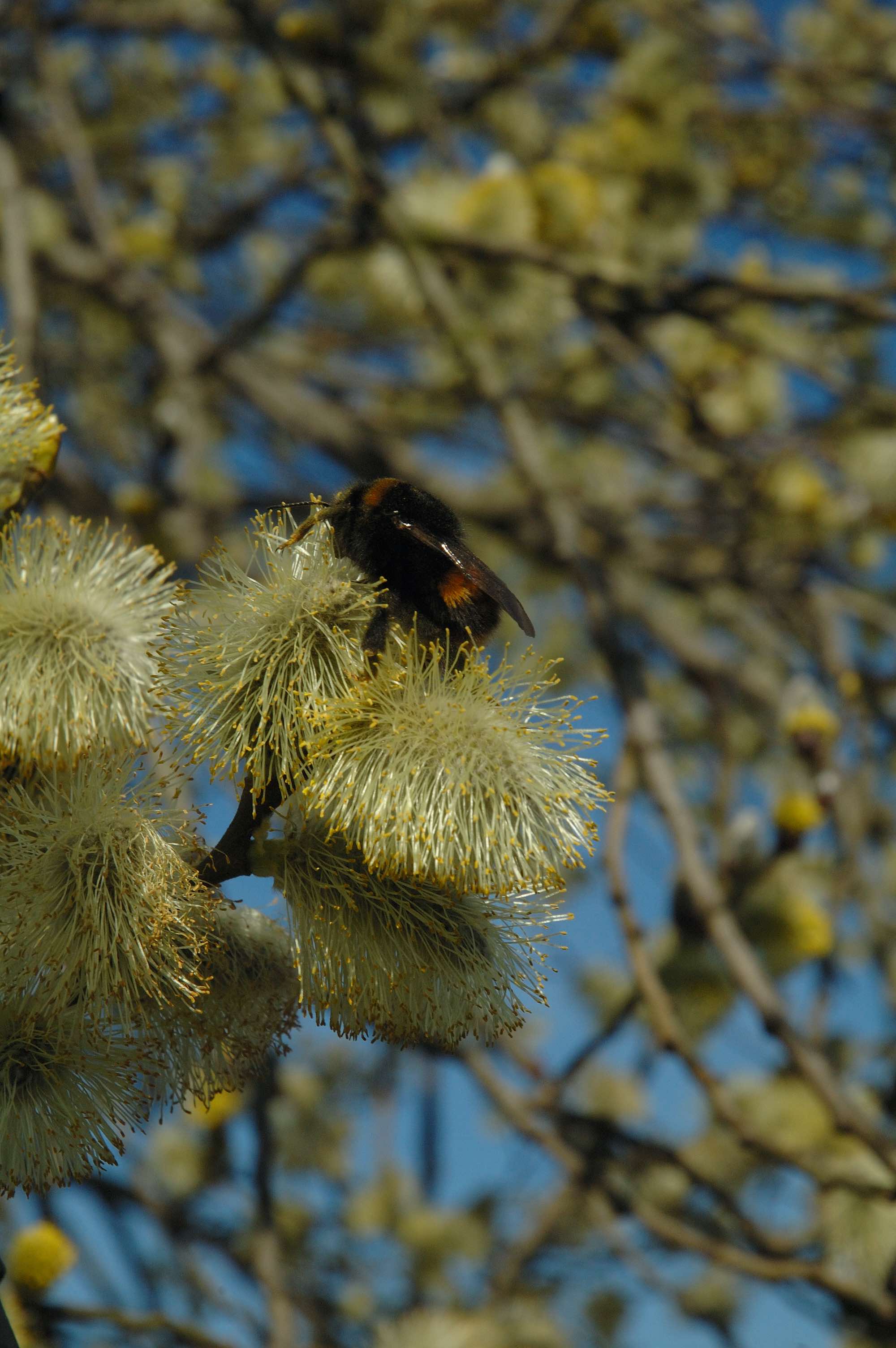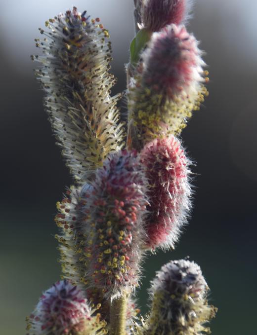 Plants of the common willow, goat willow or ‘sally’ (Salix caprea) are either male or female and while the female plants have smaller catkins that result in cottony fluff in early summer as the seeds are released, it is the male plants that catch the eye at this time of year. For weeks the bud scales have been dropping off the catkins, revealing tiny, silvery velvet humps. But now they are expanding and are irresistible to stroke. It is rather peculiar but I just can’t help myself from stroking the silky hairs. A little later the stamens emerge, at first from the base of the catkin, to release masses of pollen. Most catkins on other plants are wind pollinated but these willow catkins are visited by bumblebees so a willow is good for my sol and the bees.
