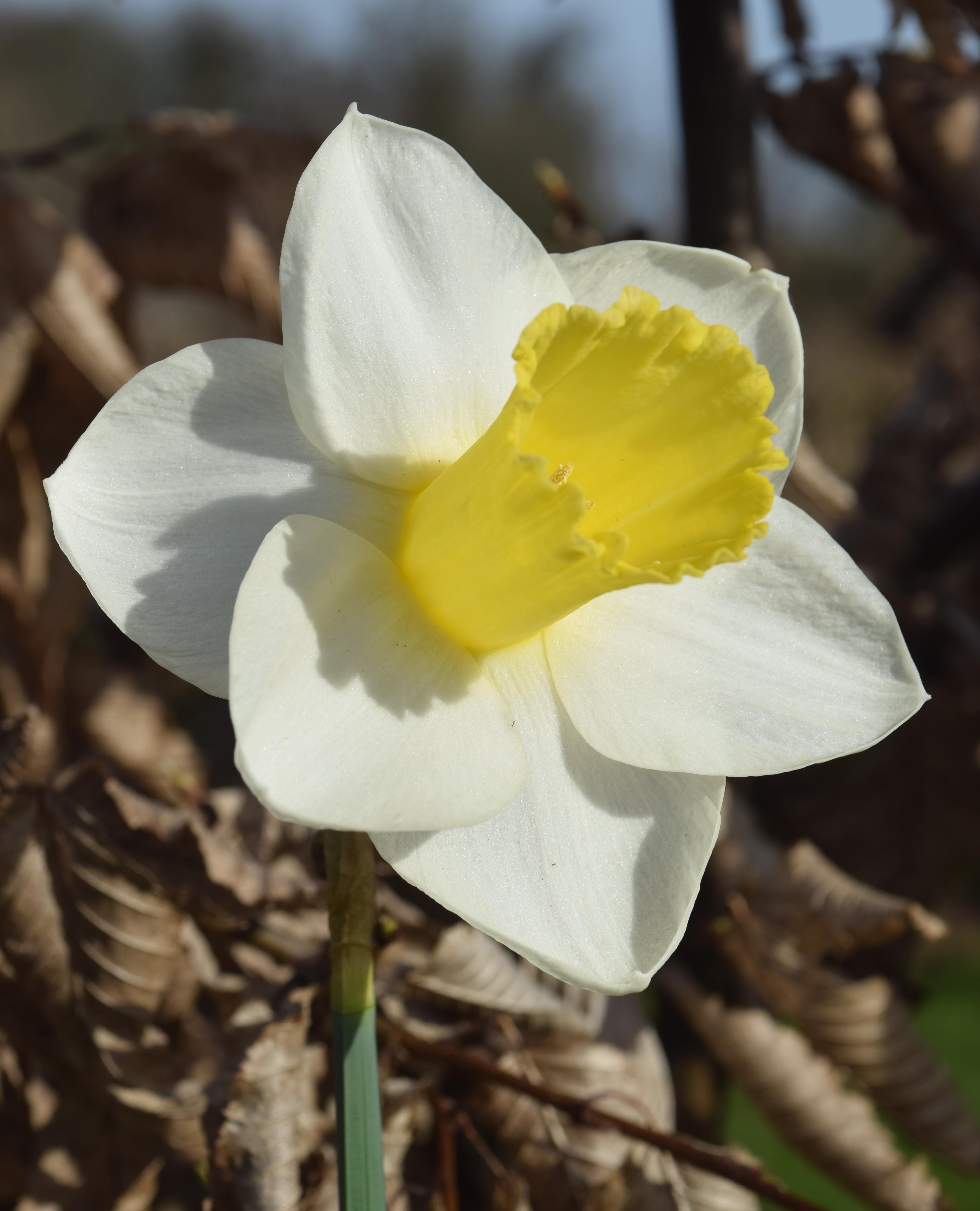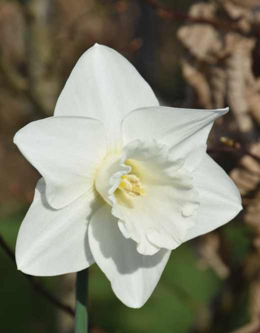 ‘Love You More’ (2 W-W) seems to be unregistered but is my favourite white daffodil in the garden. Large-cupped rather than a trumpet daffodil, it is a sturdy flower and blooms about two weeks earlier than ‘Mount Hood’ which is the standard (although old) white daff. It is pure white with a greenish centre and although the petals are a bit creased and twisted it is elegant and delightful. The cup is only just shorter than the petals so is almost a ‘trumpet’ (Division 1). It has not increased much but that is not always a bad thing in the garden because it means it doesn’t need frequent division.