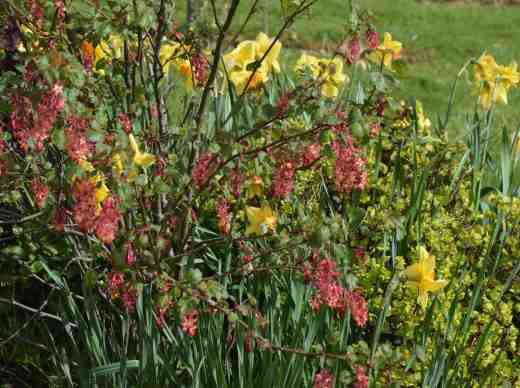 Few of the ribes earn the desciption of ‘exciting’ and the ubiquitous R. sanguineum is often despised for the harsh pink colour of the flowers and the smell of the foliage which I don’t actually find that disagreeable. It is also very easy to grow and that makes it less than desirable among those who prefer plants that are challenges. I have yet to find a really good (and unusual) cultivar to put in the borders though I have mixed the plain species in my mixed hedge, where it keeps the bees happy. And with so much white and yellow in the spring garden I actually welcome the pink. There are is a rather nasty variegated form that looks like it is planted under a pigeon nest, and the yellow leaved ‘Brocklebankii’ which I left behind when I moved and will be snapped up when I see one. Pink flowers set against yellow leaves should fill me with horror but I actually find it oddly uplifting.