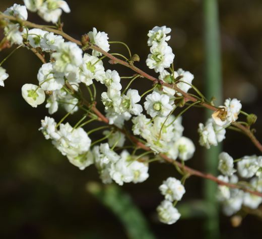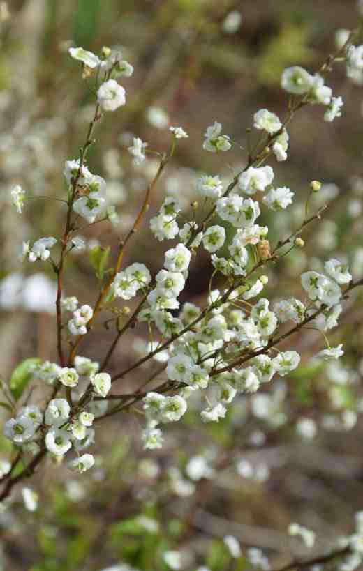 It is one of those curious plants that was found and introduced as a double-flowered form (like kerria) and so, although it has double flowers, it is Spiraea prunifolia – the single-flowered form (rarely grown) is forma simpliciflora. The double-flowered form was found by E H Wilson in W. Hupeh, China, where it was cultivated. It was actually introduced from Japan in 1845 and was sold, two years later, at a ‘guinea’ a plant. Today it is rather neglected. It is larger than more modern spiraeas but it has small leaves and an elegant, arching habit, not yet obvious in my plants. Perhaps we don’t need more white flowers in spring. But I get a lot of joy looking at the individual flowers. They are only 1cm across but they are abundant and they are so cute!
