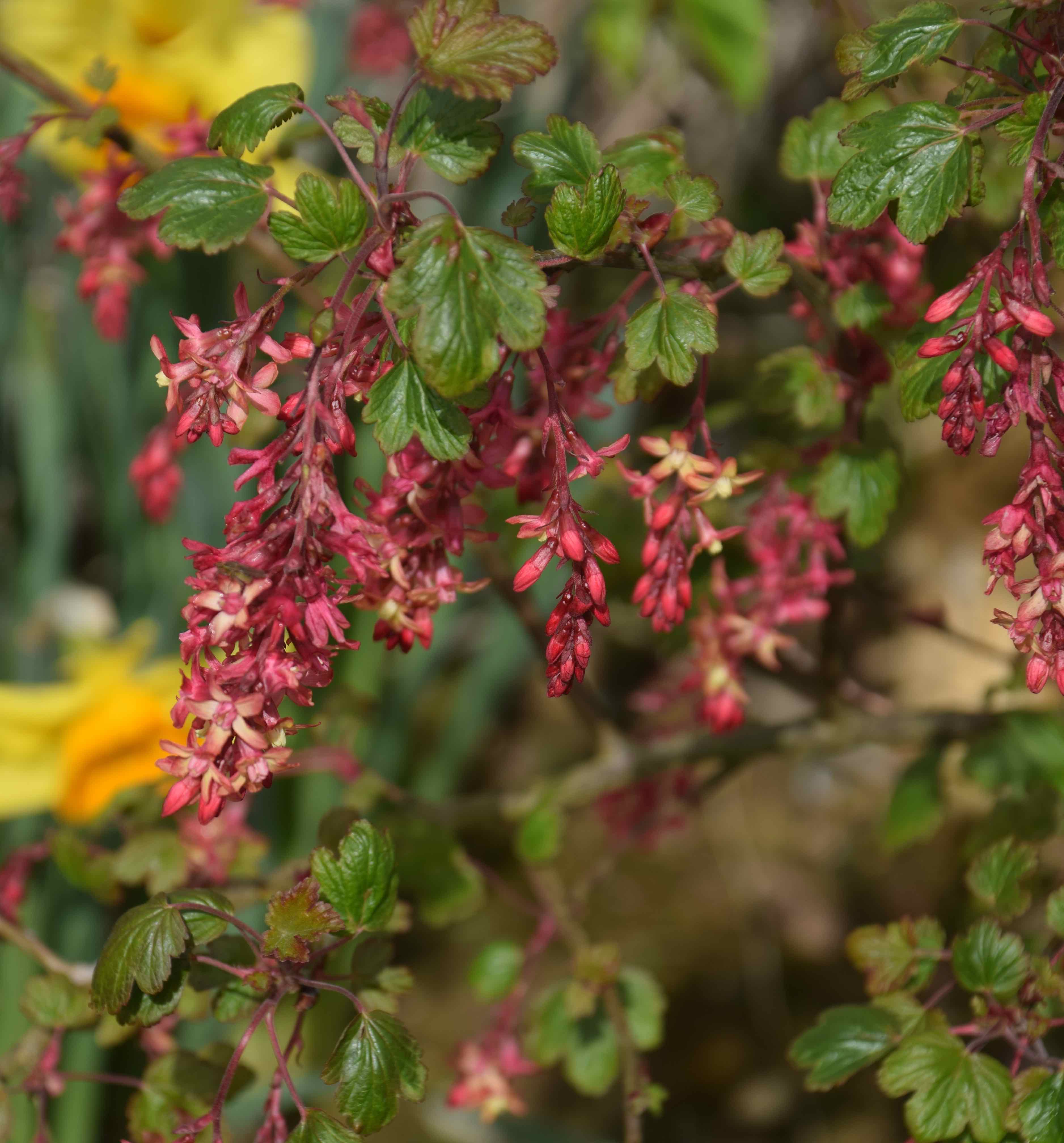 Few of the ribes earn the desciption of ‘exciting’ and the ubiquitous R. sanguineum is often despised for the harsh pink colour of the flowers and the smell of the foliage which I don’t actually find that disagreeable. It is also very easy to grow and that makes it less than desirable among those who prefer plants that are challenges. I have yet to find a really good (and unusual) cultivar to put in the borders though I have mixed the plain species in my mixed hedge, where it keeps the bees happy. And with so much white and yellow in the spring garden I actually welcome the pink. There are is a rather nasty variegated form that looks like it is planted under a pigeon nest, and the yellow leaved ‘Brocklebankii’ which I left behind when I moved and will be snapped up when I see one. Pink flowers set against yellow leaves should fill me with horror but I actually find it oddly uplifting.