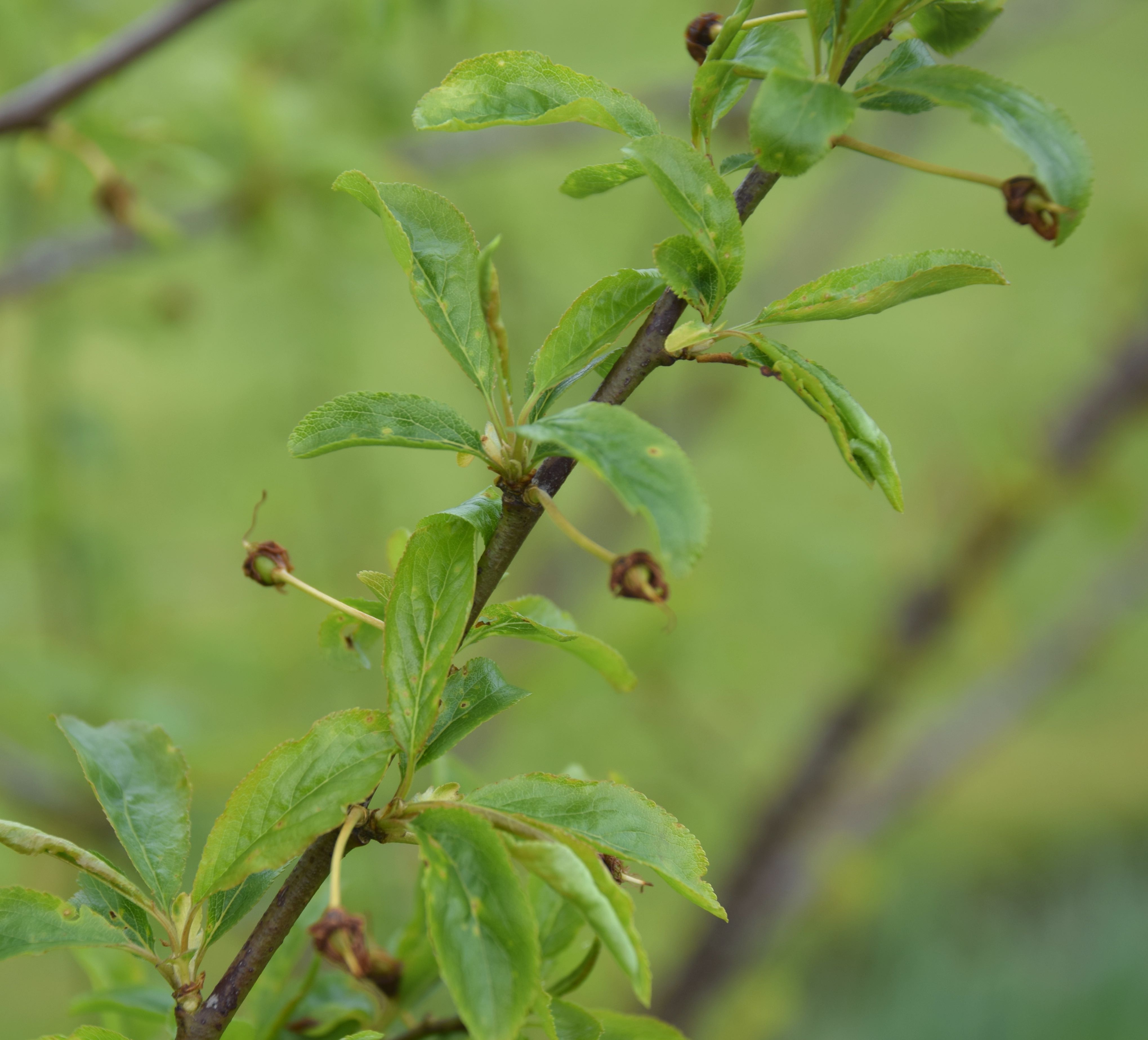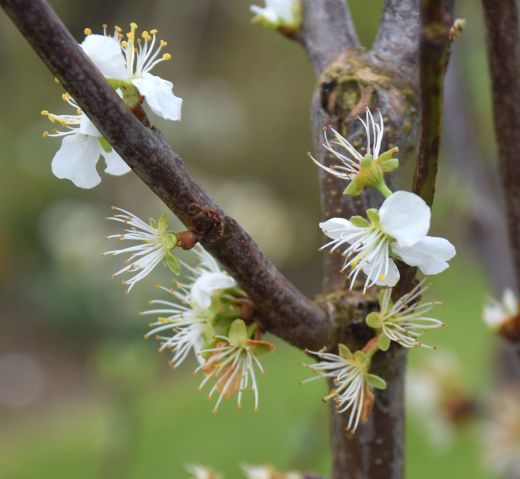 The ‘soft’ spring, dominated by wet and wind, has not suited me well. I crave some sun so I can frolic in the bright light along with the tulips. Even the fox that visits daily looks fed up with the rain as he looks at me through the window, hoping I will feed him. But it does hold some promise for the fruit trees. The apples are yet to open but the pears are trying. More crucially, the plums have flowered well and, by hanging up CDs in the trees, I have managed to keep the finches off the blossom. The Japanese plum ‘Lizzie’ opens before the others, far too early to be sensible, but there are tiny green plums (and I mean tiny) on the tree. I brushed the old flowers and most dropped off, having failed to ‘set’ but there are some that are hanging on and show that there may be a crop.