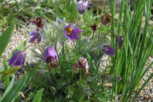 I am definitely late posting about Pulsatilla vulgaris which I always know as the Pasque flower, named after the French word for Easter, itself derived from Pesach or passover. My plant is in one of the raised beds to give it the perfect drainage it requires. This is a European native, usually on chalky soils, growing in short grass, that is obviously related to anemones. The foliage develops after flowering and is grey, carroty and hairy. The flowers open for several weeks though most of mine have failed to open this spring, being soaked with rain and rotting rather than opening. This is a shame because the regal contrast of golden stamens and purple petals is really rather grand. There are other species that are smarter and many varieties with other colours and some with semi-double flowers but the plain species has plenty of charm.