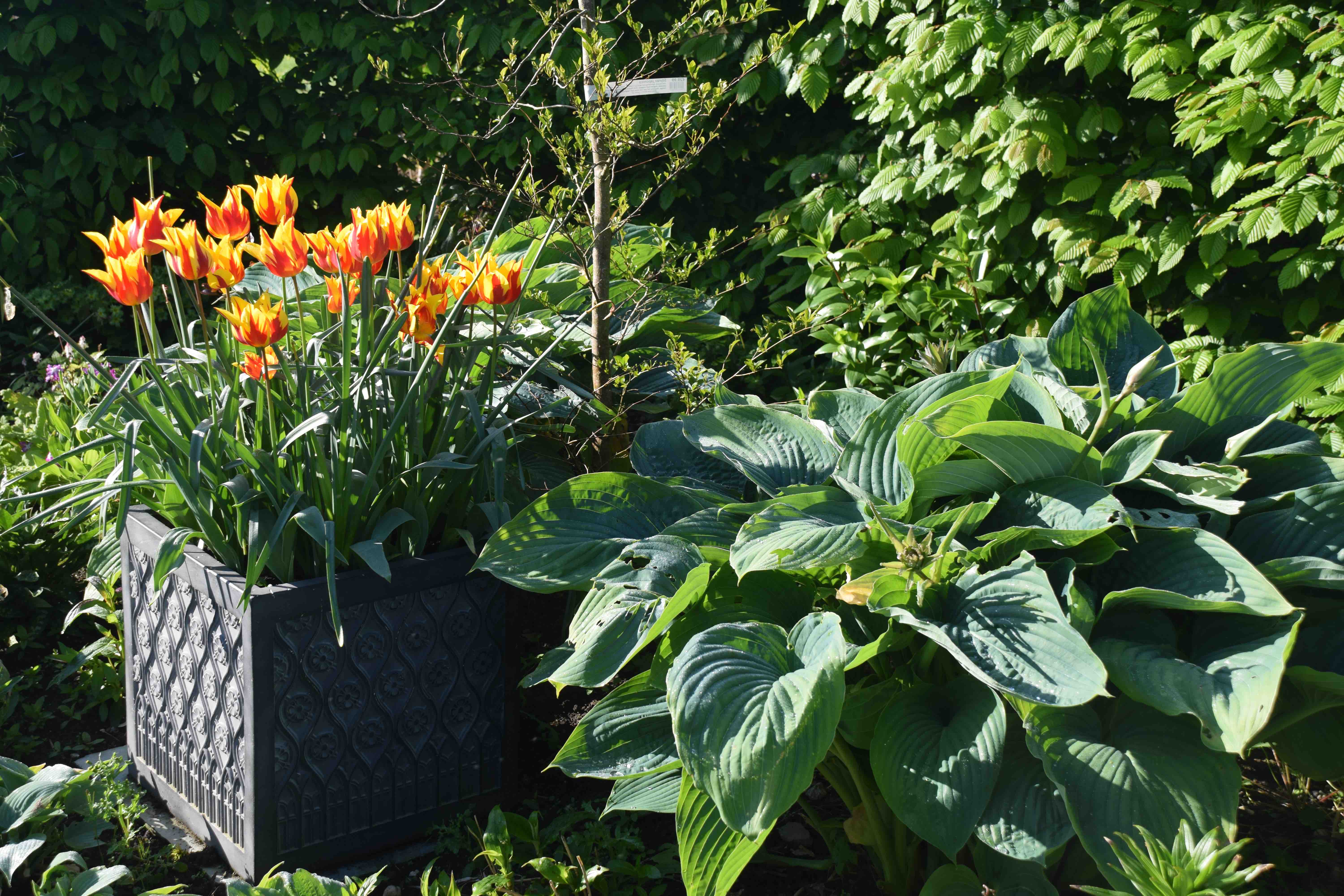The tulbaghias have had a tough few years but are now settling in. The same is true of ‘Empress Wu’, one of the largest, if not the largest, hosta cultivar. Like many large hostas it takes several years to reach its full size and having moved and divided mine four years ago it has slowed establishment a bit. But I think this is the year it will get into its stride. Two sit either side of the styrax and another in more shade. It got lightly caught by the last (I HOPE) frost of the season but is growing out of it. I am tempted to remove the flowers this year to boost the leaves and I have given them a feed of chicken pellets to push them a bit more!