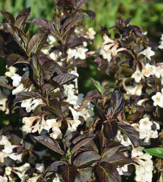 After a couple of years of struggling, weigela ‘Courtacad 1′ (Black and White’), is settling in. I have added a few more weigelas this year and will feature them soon. They are a bit unfashionable and old-fashioned and it is true that they don’t flower for long. But breeders have been busy expanding the colour range, producing some that rebloom later in summer and to produce forms with variegated leaves and more compact habits. All of which should make them more popular. A feature of these new kinds that I don’t like is that the flowers are small and more tubular. But provided they are not dwarfed so much that they only have enough vigour to grow in a pot of compost and can’t cope with garden conditions (a common fault with some new plants) I won’t be too critical. This one is interesting and at least when the flowers die the brown blooms are not as obvious against the dark foliage as they would be against green! It is compact and should only reach about 45cm high and about twice as wide. Mine is that high after three years but has not yet developed middle-age spread and is rather upright. I like it in a curious way.