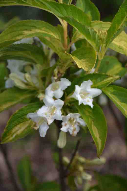 ‘Milk and Honey’ is a new one to me with white flowers and leaves with a central gold splash. I like all variegated plants (well most) and particularly admire those with white or yellow central blotches on the leaves. I can’t find out much about this one and it either reaches 1m or 2m and it appears to be new although one site uses the name for what appears to be W. middendorffiana – a yellow-flowered species. Although my plant is young I like the combination and I can’t wait for it to mature to whatever height it decides.