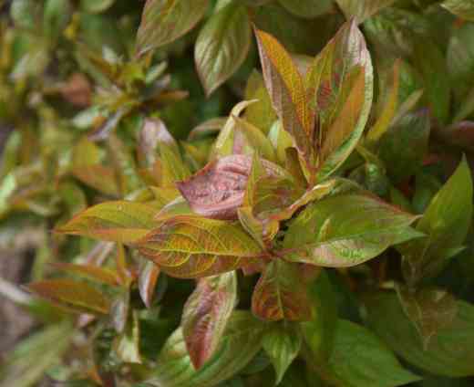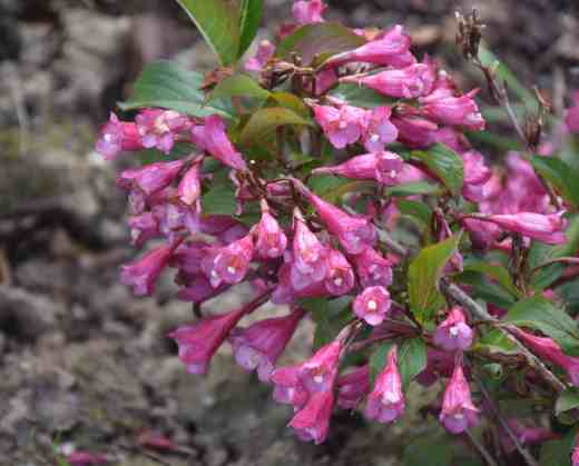 I am starting to wonder why I planted ‘Wings of Fire’. It is primarily grown for the foliage which is bronze, turning red in autumn. The flowers are dark pink but not freely produced. In fact, although my plant is now almost 1m high and wide, I have not seen a single flower. It seems ridiculous to grow a weigela for foliage only, but most of the new kinds have anything but green leaves. I have mentioned ‘Olympiade’ already but another that I once grew is ‘Verweig’ (MONET) which has purple leaves with variegated edges that create a fussy mass of pink, cream and purple and it blooms well. It is dwarf and, although a bit too visually confusing for me to love, is a good thing.