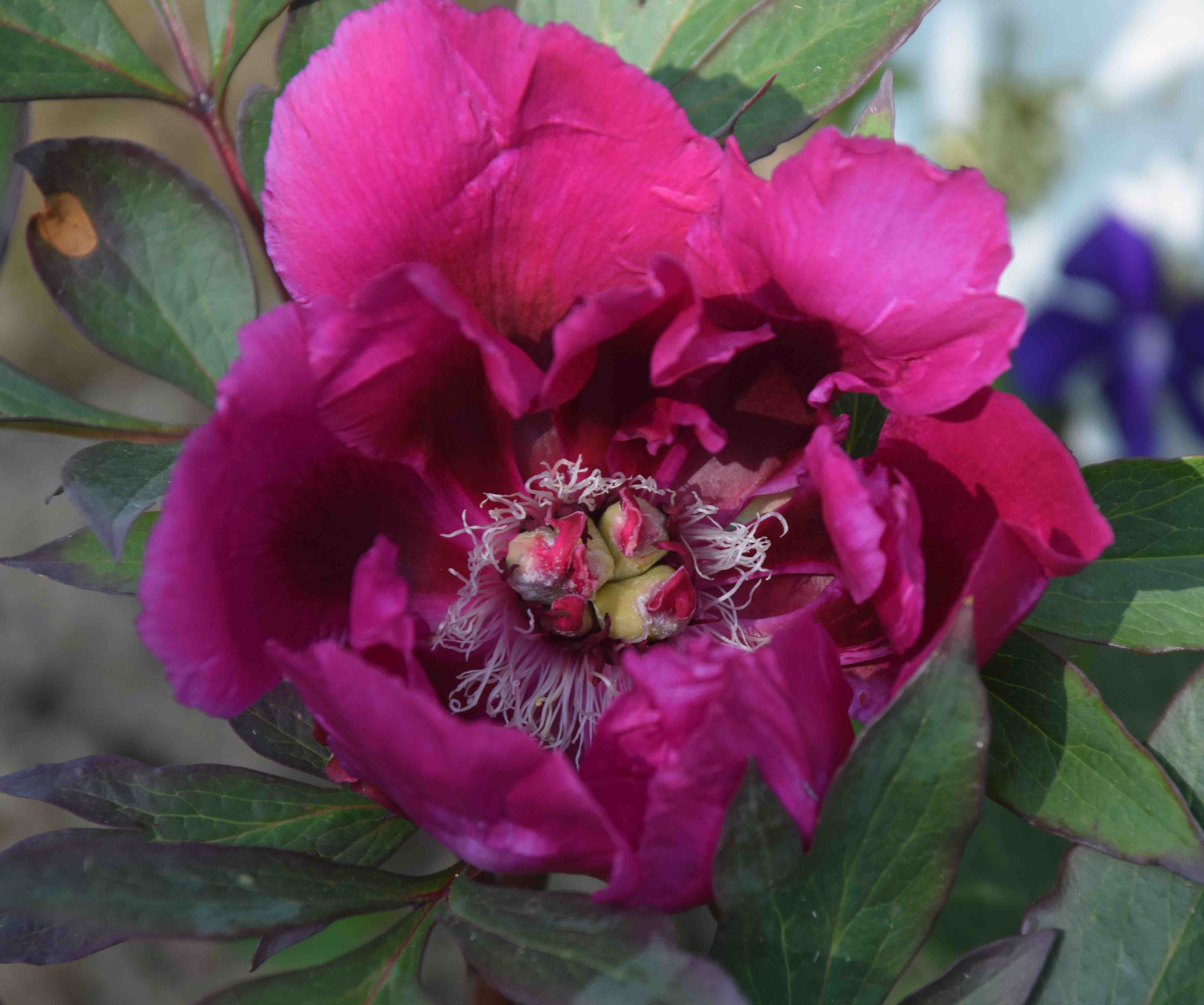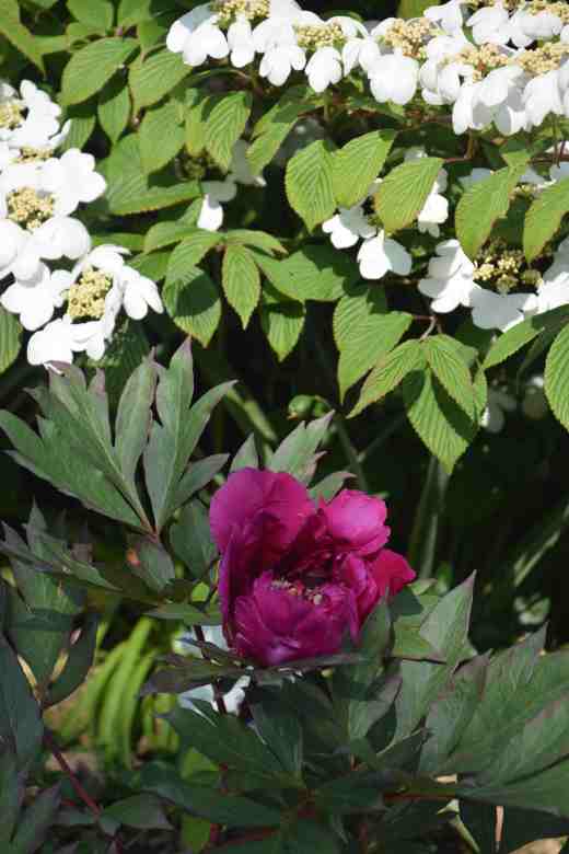 Completely unrelated, but a similar colour, the first flower has opened on a new Itoh peony. ‘Purple Sensation’ has flowered in its first year, after planting as a bare root so I can’t ask for anything more, though I was worried that a couple of shoots died off after producing a couple of leaves. I will cut off the flower as it fades to help the plant bulk up but I can’t resist letting this beautiful flower open. It is too close to the viburnum really but I will carefully shape the overhanging branches to give the peony room and I like the combination.