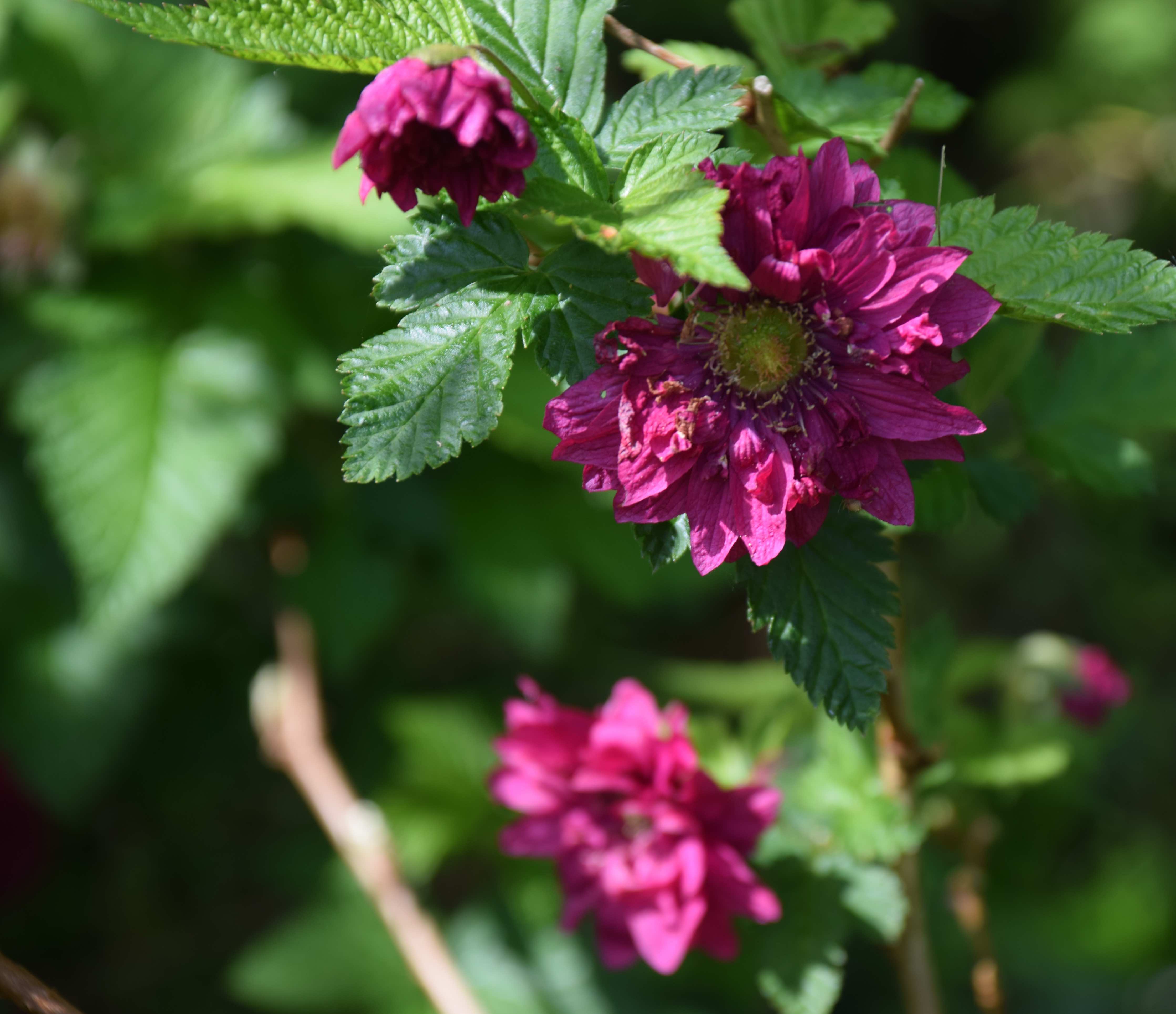 They key to a good garden is finding the right spot for a plant: not just the spot where it looks its best but also where it will grow well. I posted recently about the territorial designs of Rubus spectabilis ‘Olympic Double’. It had suddenly made a break for, not just the border, but the rest of the garden! It had to be ousted before it became a real nuisance.