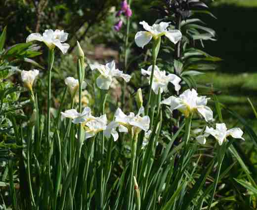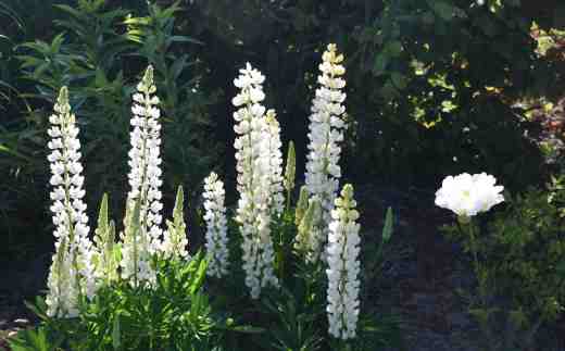 The sunny weather continues, although sometimes high clouds, so often associated with high pressure systems, cool things for a while – providing a welcome time to water. Late in the afternoon yesterday the light had a magical quality that seemed to illuminate the paler flowers in the garden. We are always encouraged to plant white flowers to brighten up dull or dark areas, and they do the job admirably. But in sun they have a special brilliance, especially when backlit, like the ‘Cathy’s Ghost’ lupins above and below. This seed-raised lupin has proved very amenable to less than ideal conditions and, because I leave a few pods to mature, has sown itself and come true to type.