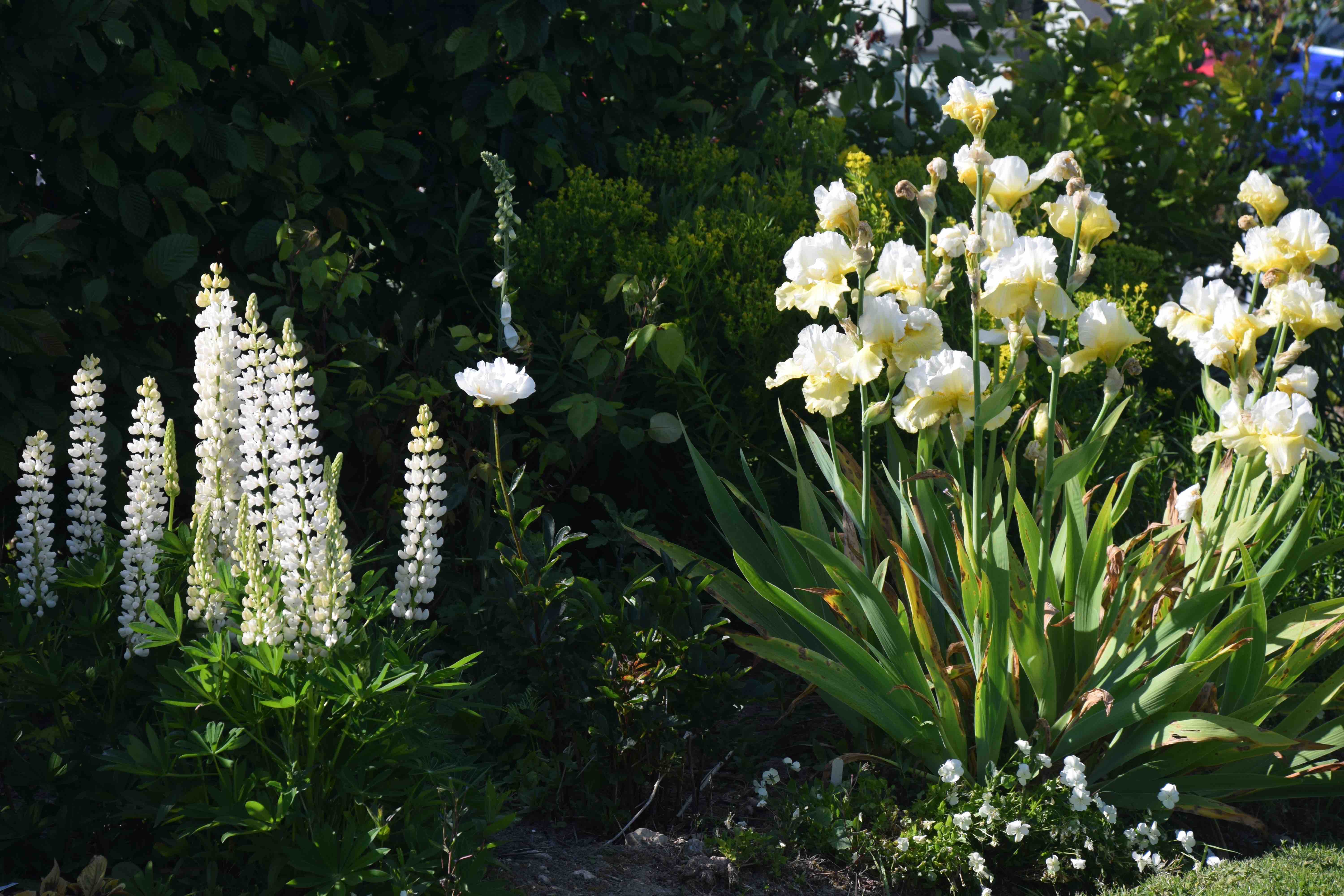 The sunny weather continues, although sometimes high clouds, so often associated with high pressure systems, cool things for a while – providing a welcome time to water. Late in the afternoon yesterday the light had a magical quality that seemed to illuminate the paler flowers in the garden. We are always encouraged to plant white flowers to brighten up dull or dark areas, and they do the job admirably. But in sun they have a special brilliance, especially when backlit, like the ‘Cathy’s Ghost’ lupins above and below. This seed-raised lupin has proved very amenable to less than ideal conditions and, because I leave a few pods to mature, has sown itself and come true to type.
