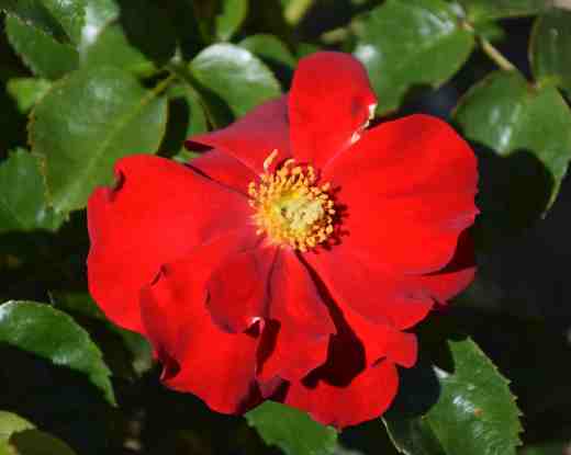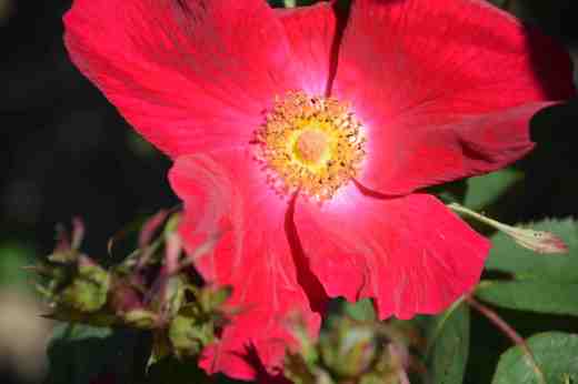 It is a modern shrub rose (or Gallica Hybrid). It is a strong grower and has masses of large, single flowers that are followed by large, showy hips. If it is deadheaded it will have a second flush of flowers (but no hips). My plant is just starting to bloom.