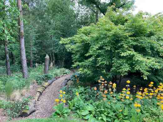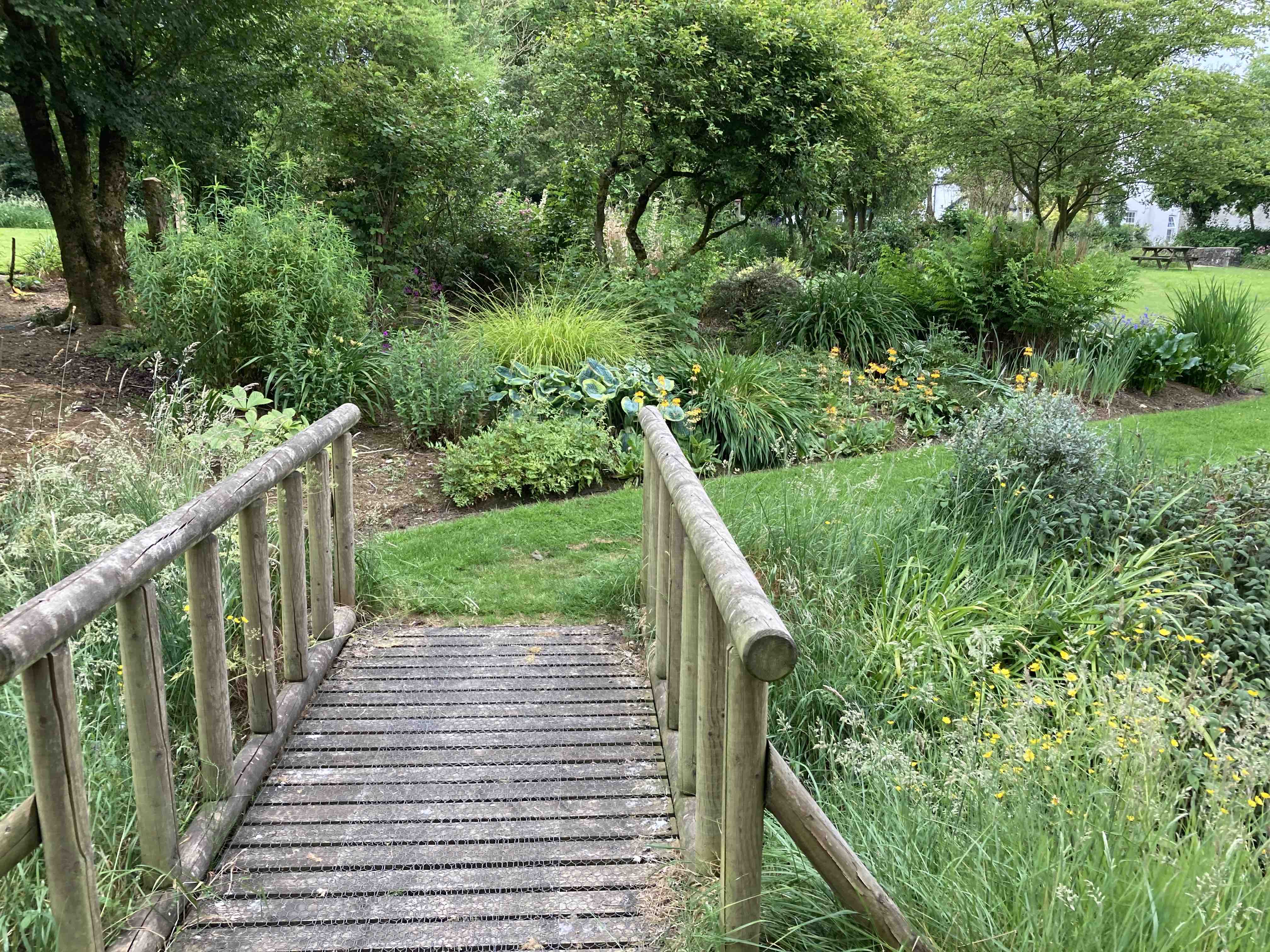 The garden at Ballyrobert is extensive and very comfortable. It seems that natural openings in woodland become gentle flowering meadows or glades bordered with shrubs and herbaceous borders. The light shifts from gloomy to bright as paths under trees open to sunshine and lead through longer grass and over bridges crossing (at the time dry) streams that meander through the site. It is a garden that is hard to map in your head and you never know what is across the next bridge. Sometimes a path reveals a new view of a part of the garden just traveled, sometimes you appear in a new area. It is all very enchanting and exciting.
