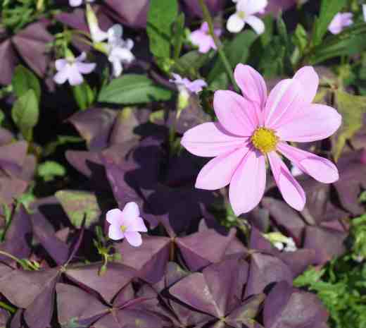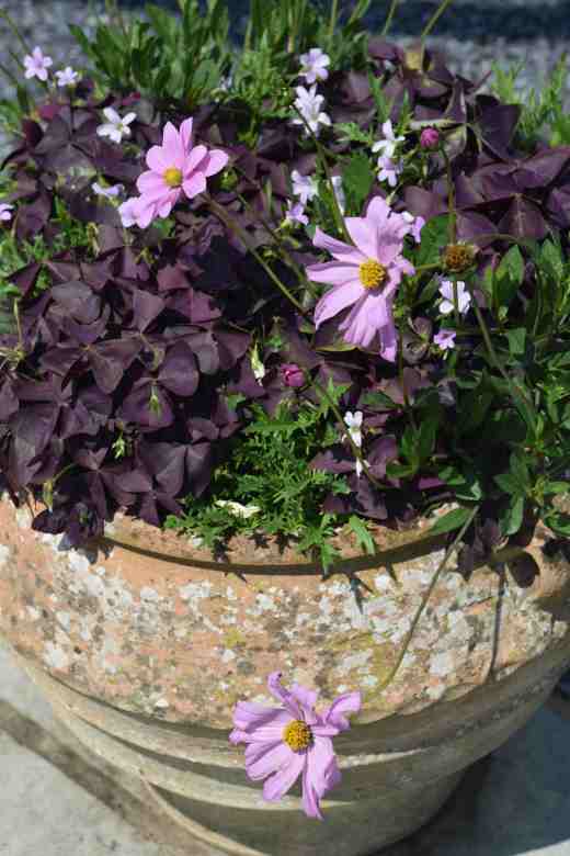 The question I now need to ask is whether it is worth the effort since annual cosmos are so easy to grow, and actually self seed in the garden. The flowers are subtly different to annual cosmos, and the leaves are very different. It is nice but if I can’t keep it I won’t be in a hurry to replace it. I am not hoping it will die and I will do my best with it but the annuals are so good – and much less expensive. Perhaps I will collect seeds and see what appears among the seedlings. There may be some good things. My plant is in a pot with purple-leaved oxalis (ridiculously easy to grow and propagate) and some isotomas which should become covered in pale blue stars when they finally make the effort – they are really slow from seed!