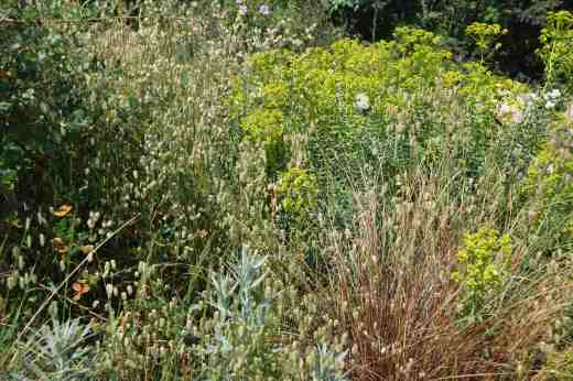 The other grass is Briza maxima, quaking grass, a native from the Mediterranean basin. This is an annual, unlike the perennial B. media which has a more northerly distribution, including Ireland. Briza maxima has, appropriately, larger seed heads. These are like lockets and hang from wiry stems, making it a great mixer and a lovely addition to the garden. Of course, it seeds freely and the seeds, with their inflated shape, spread in the wind. Each locket breaks up into 20 or more seeds so you can see that this can be a prolific plant in a sunny spot. I tend to take a casual attitude to its wanderings and just pull up the unwanted plants (lots of them) in autumn and spring. Their rather soft, broad, slightly hairy leaves make them easy to identify. They can be sown in spring but, now they are in the garden, the seeds germinate in autumn and overwinter as young plants. Most of mine are in a dry bed where they mix with annual poppies, bronze carex, cistus, white silene, artemisia and euphorbia in a totally natural grouping and I am content, for now. It is an uncharacteristically ‘loose’ bit of planting for me and I enjoy it.