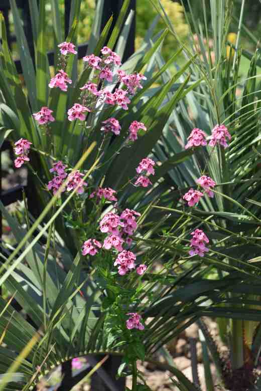 Far more like my usual sort of thing is Diascia personata. I was given this as a cut stem last year (thank you Meriel) and took half a dozen cuttings from it. They rooted and most survived the winter in the cold greenhouse. Unfortunately they were attacked by aphids but once these were eliminated the plants grew strongly. I should have pinched out the shoot tips in spring (I had done in autumn) and they are rather straggly, flowering at 1m high. I planted them around my butia palm and they are branching at the base and flowering their hearts out, and should do so till the autumn frosts.