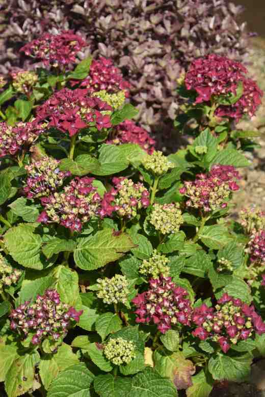 After many years of trying, and failing, I finally have a mophead hydrangea not just alive but getting bigger. I was not sure why I just couldn’t get one to settle in. This one was potted up and kept in a pot for a year so it was bigger when planted out. It got through the winter and had a very light prune and has decided to bloom. It seems ungrateful but I am not that keen on the colour – it seemed a good idea at the time. But I hoped it would grow and flower and put it beside pittosporum ‘Bannow Bay’ that, seasonally, has pink/purple foliage that makes a good match.