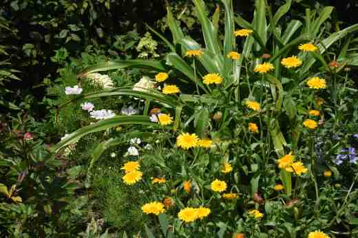 Calendulas and nasturtiums are two annuals that most of us only have to sow once – they pop up every year after that. This can be a nuisance but it is also welcome and I am grateful for calendulas in particular. They don’t always breed true but all are pretty and I like their smell. I am grateful to this one for at least providing some colour in front of my clump of Crinum x powelii. The crinum is now four years old, was planted as a big pot of bulbs and it has not bothered to produce a single flower yet. I know it likes sun and good living so it was given lots of feed this year, whenever I was scattering fertiliser around, but I am starting to resent its ingratitude. How different to the calendulas which are so eager to please.