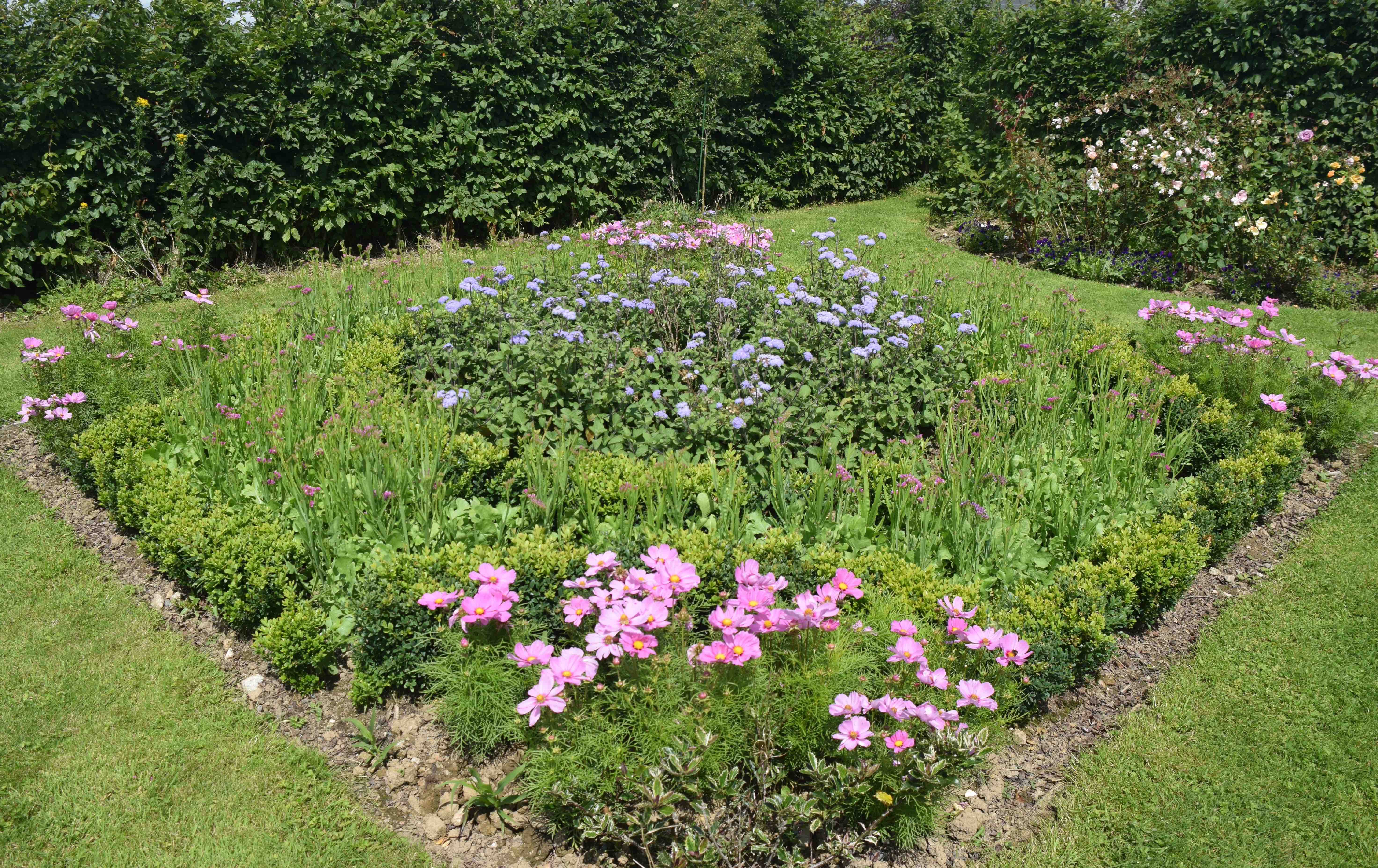 I finally thought I may have cracked the box-edged, formal beds this year with a combination of dwarf cosmos, statice and (perennial) ageratum. I see that some of the statice are not the right (pink) colour but it is slowly coming along and definitely better for the wet weather. I will post another in a few weeks when there is more colour showing.