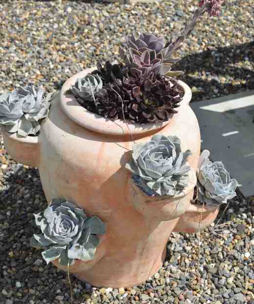 Planted pots are important to me but I don’t have as many actual large pots as I would like, mainly because of cost. I had to get a strawberry pot for an article I had to illustrate and that was annoying because I find them very impractical, especially to water. It had to be planted with strawberries but once they had cropped I could empty them out and this year some echeverias were popped in. They won’t be so traumatised if they dry out, though they are just as likely to be attacked by vine weevil!
