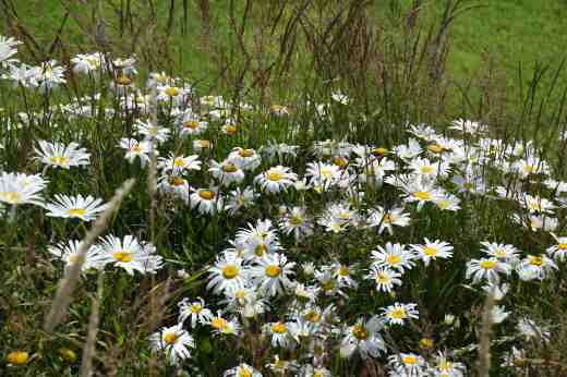 Some of the batch of leucanthemums grown from seed last year were put in the ‘wild flower’ patch, an area of long grass for the butterflies, moths and beetles (plus the slugs). Most of the other flowers from last year are now crowded out but the leucanthemums have done well. and are battling the grass.