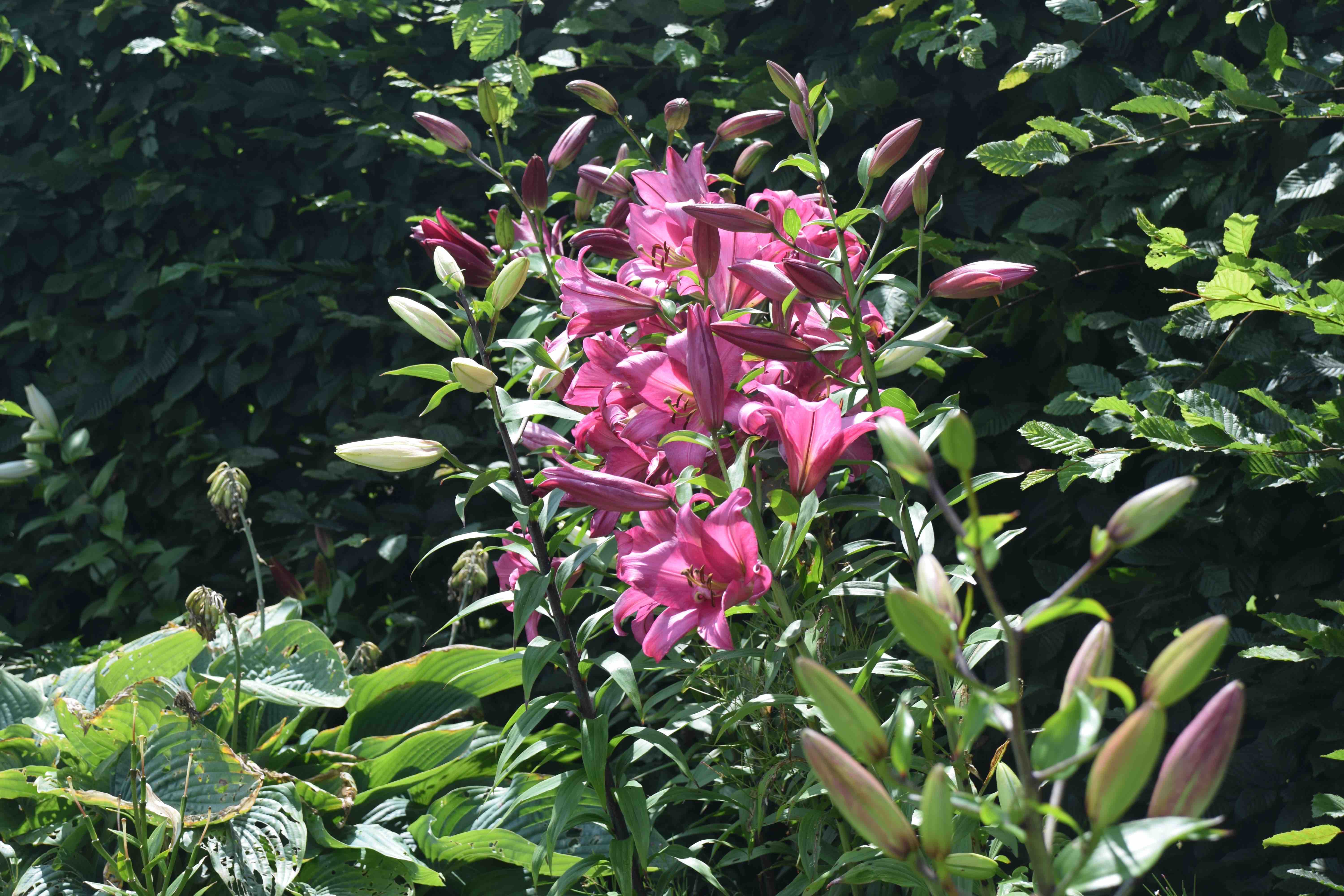 The lacy grey plants in the foreground are hostas – snails have been a plague this summer!