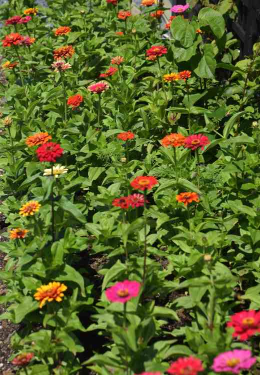 The zinnias needed frequent water after planting out in the dry, hot conditions of June but July has suited them better and they are growing fast and strongly, as I would expect. And many are blooming. In fact a lot more have flowered and I have been cutting them to sell on the flower stall (for charity) and they sell immediately with their candy colours.
