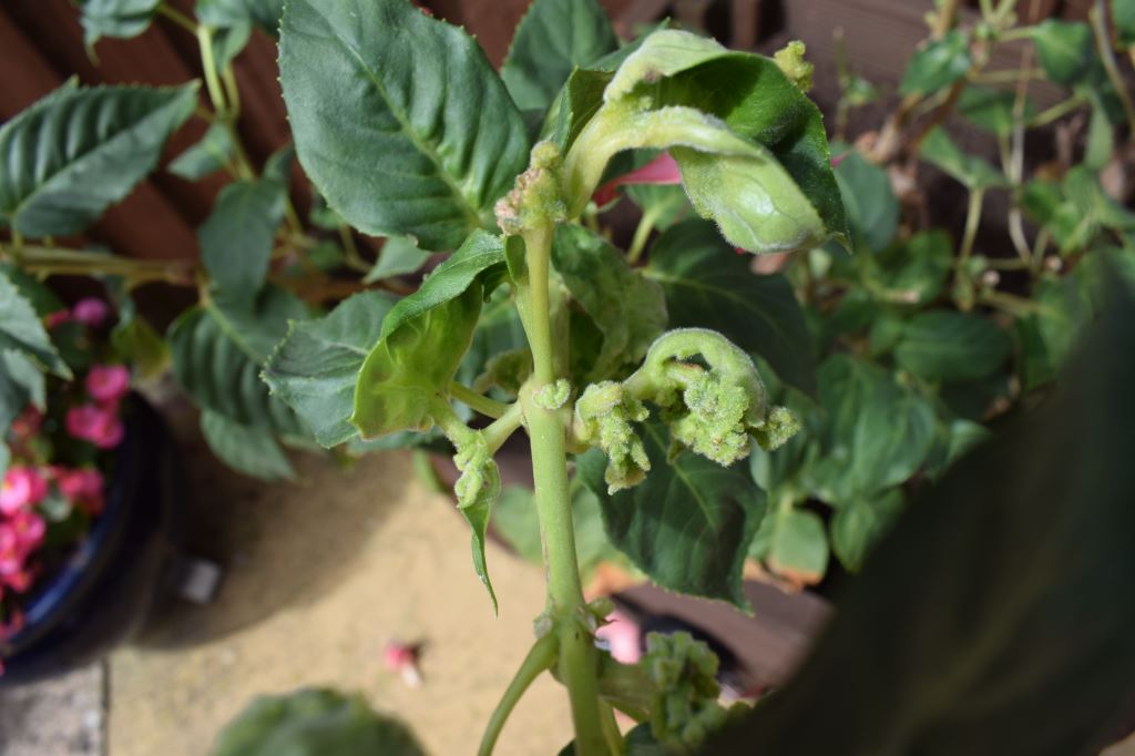 As the mites feed on the young shoots they cause swollen galls and distortion of the leaves and flowers. There is no chemical control. The best way to cope with the problem is to prune away all top growth, burn it and hope that new growth from the base is free of the pest. The trouble is that the mites are so small and can be moved from one plant to another on the skin or clothes without even knowing they are there. Not all fuchsias are affected, but most of the common types are.