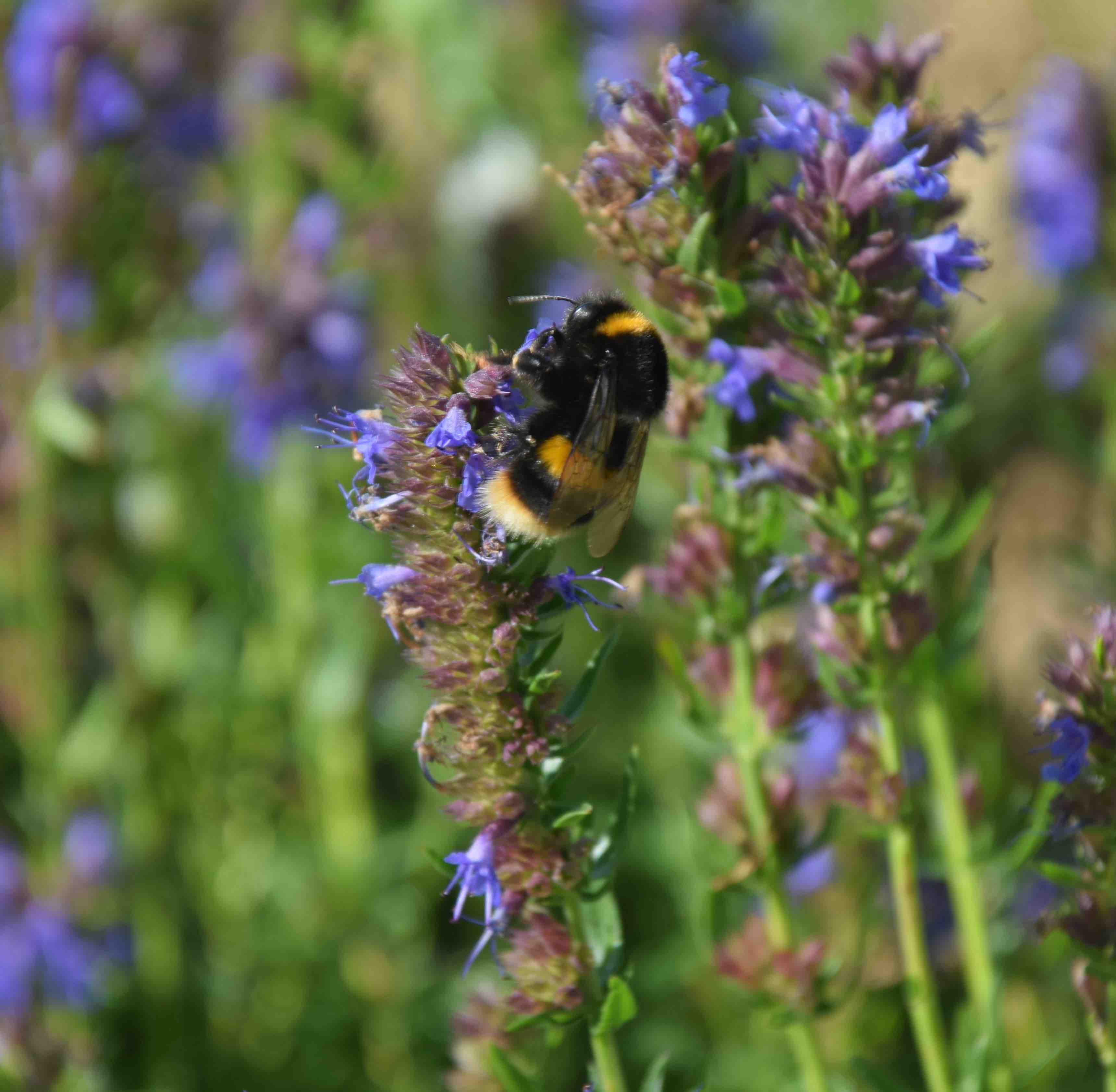 The row of lavender at the front of the house has been alive with bees for months, butterflies and moths too, but really needs cutting back now. The bees will have to move on elsewhere. Fortunately, for them, the hyssop is on bloom (top). Grown from seed, these were supposed to be blue, white and pink, but, of the 60 or so plants, only one is pink. But the bees, and butterflies, don’t care. The hyssop is a brilliant bee plant and both honeybees and bumblebees adore it, whatever the colour.