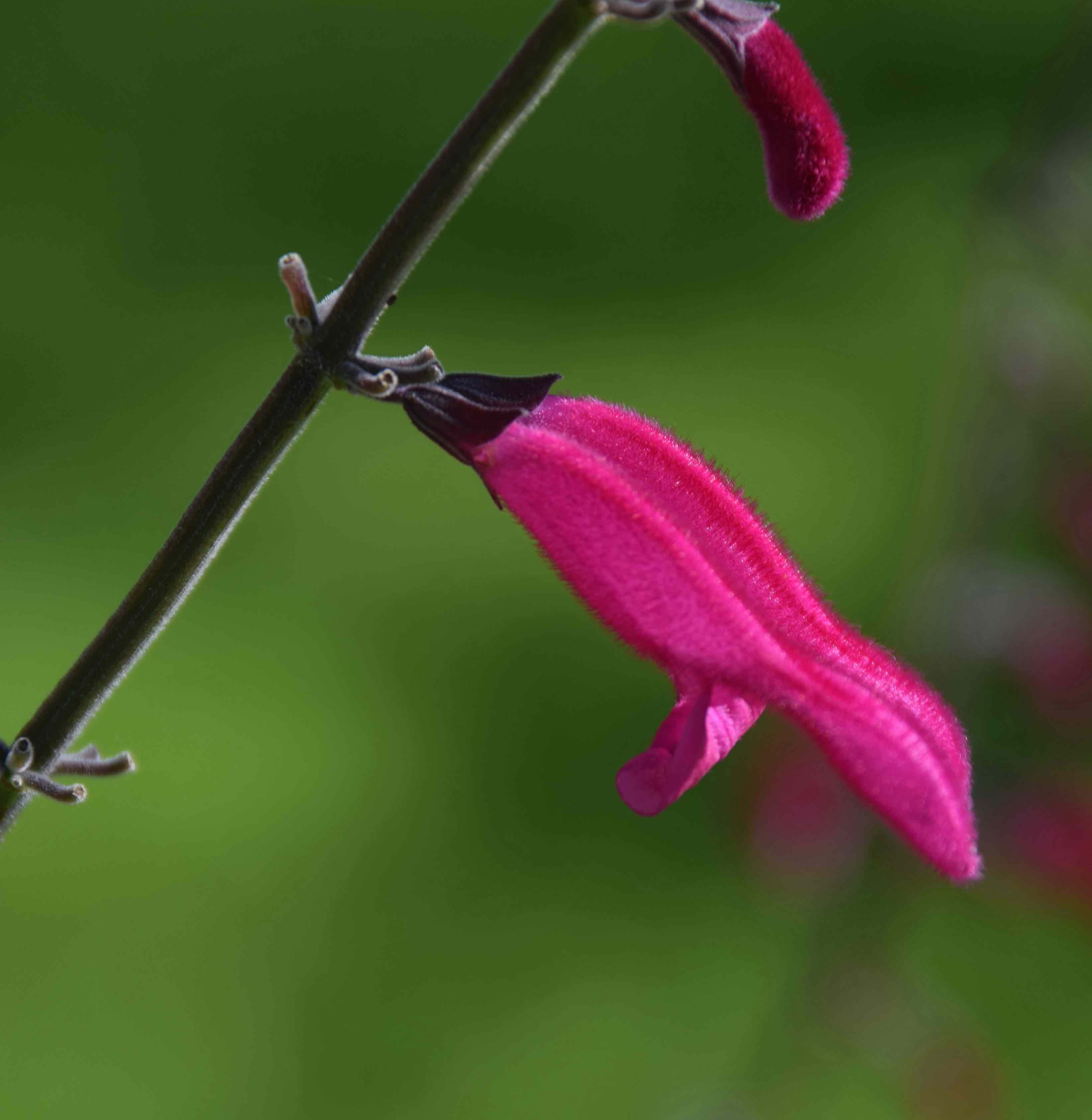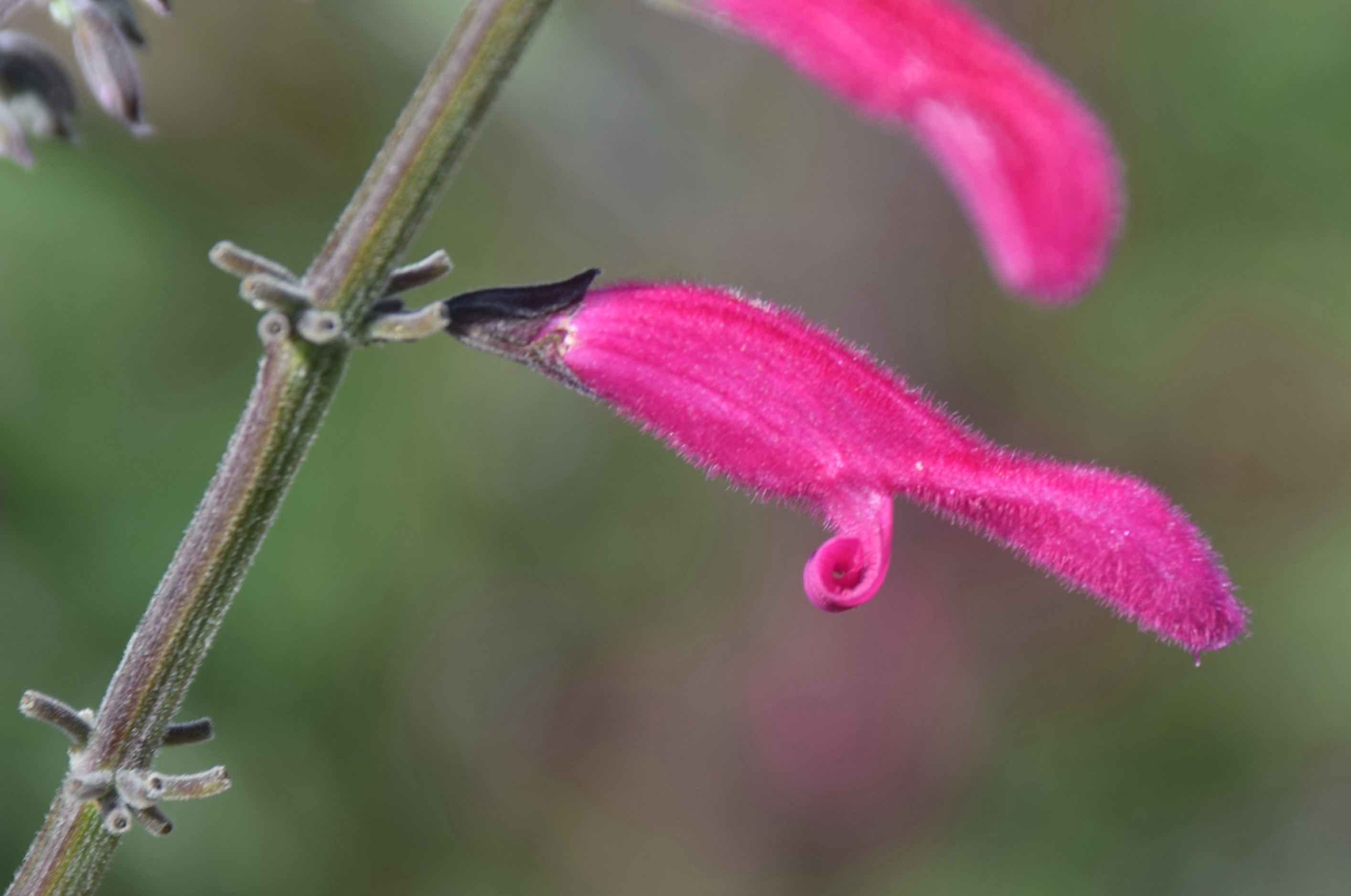 But what prompted these thoughts on bees was when I was pondering the salvia ‘Tubular Bells’ the other day, looking for shoots that would make good cuttings. This tall, slender salvia is a lovely thing but hard to photograph because the flowers are held at all angles – and it was windy! The blooms are bright cerise and hairy and the foliage neat and small. It blooms for ages. ‘Tubular Bells’ is the name given to my plant which is Salvia tubiflora and I was not sure if it was different to the species. I now think the difference is that it has richer-coloured flowers and dark stems and calyces, as opposed to green calyces in the species.