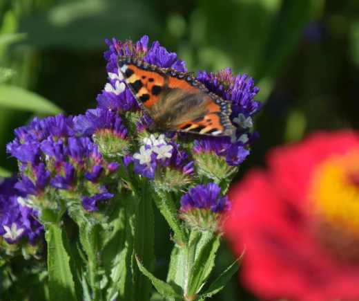 One of the collective nouns for butterflies is a kaleidoscope. Others are a swarm, flutter, rainbow and shimmer. The zinnias have been effective in attracting butterflies though it is difficult to show more than one at a time. The statice is also popular, as is to be expected. The cosmos don’t seem to be that attractive, though bees love them, and allium ‘Millennium’ is often covered in butterflies. Although there have been a few red admirals and painted ladies, small tortoiseshells have been by far the most common species, with a few peacocks. All are welcome.