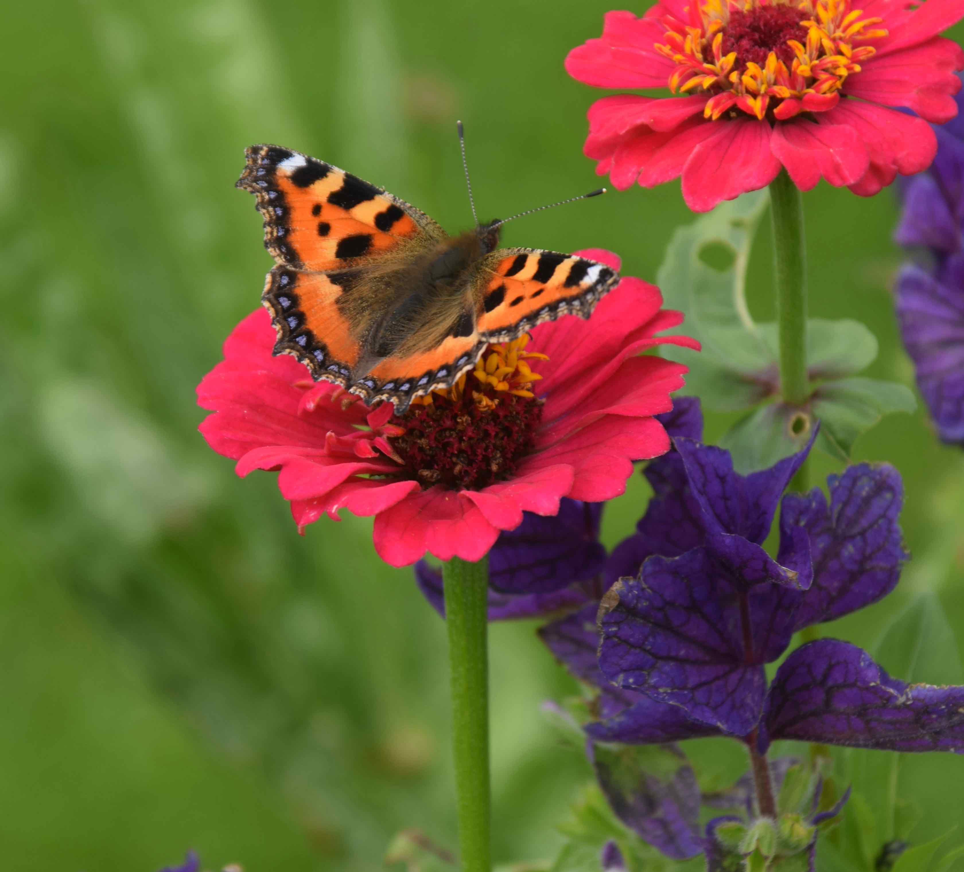 One of the collective nouns for butterflies is a kaleidoscope. Others are a swarm, flutter, rainbow and shimmer. The zinnias have been effective in attracting butterflies though it is difficult to show more than one at a time. The statice is also popular, as is to be expected. The cosmos don’t seem to be that attractive, though bees love them, and allium ‘Millennium’ is often covered in butterflies. Although there have been a few red admirals and painted ladies, small tortoiseshells have been by far the most common species, with a few peacocks. All are welcome.