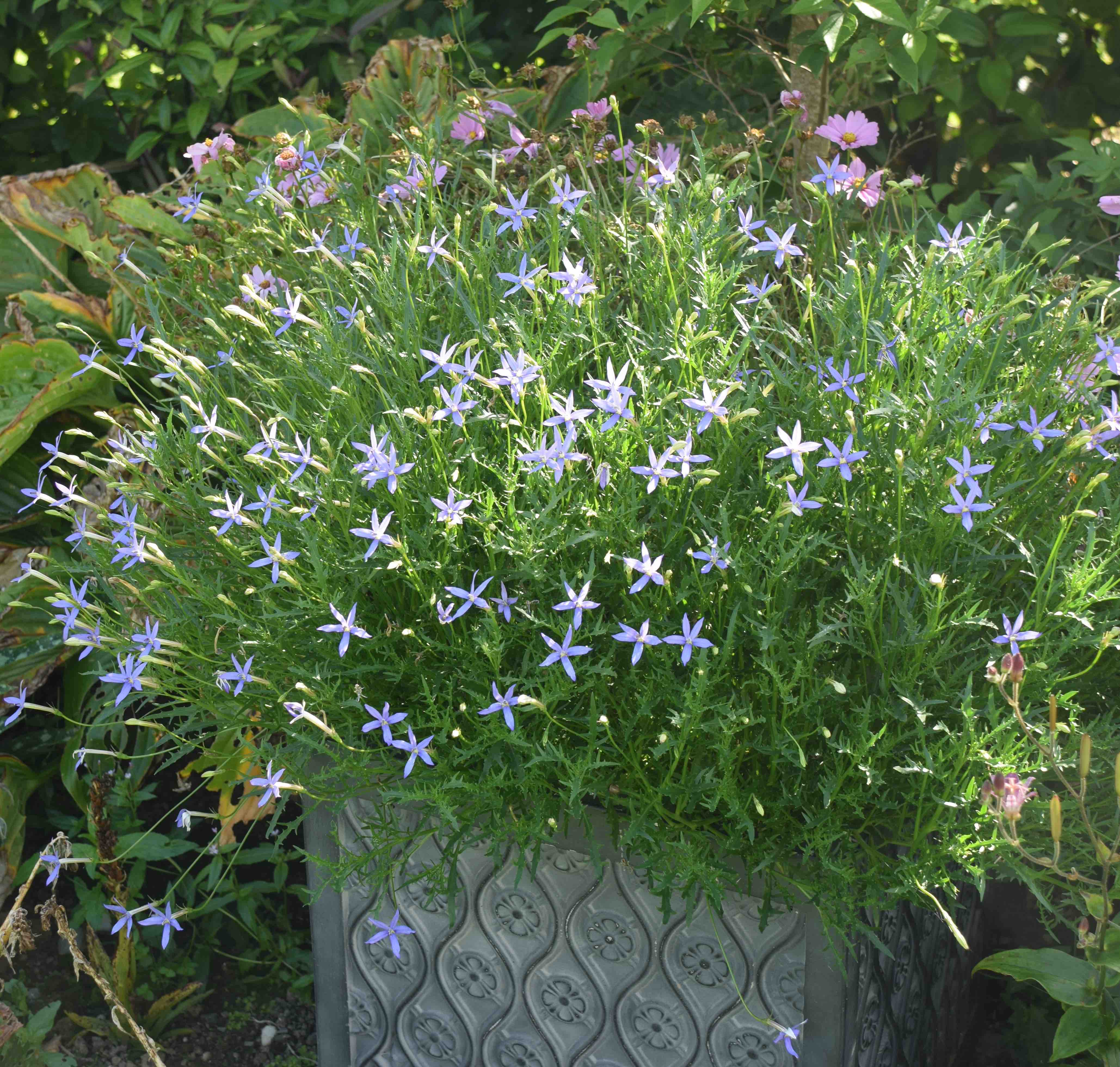 Another plant I am very fond of is isotoma. This Australian (tender) perennial is usually grown as an annual and is related to lobelia but also known as laurentia. Isotoma axillaris is a useful summer plant with starry, soft blue flowers. The seeds and seedlings are tiny and they grow very slowly at first. In fact they were so slow to grow that I almost gave up on them, but I am glad I persevered. Now they are bushy plants about 30cm high and wide and they have been flowering for months with no sign of them stopping. In the pot above the wet summer has ‘done for’ the cosmos at the back but the isotoma is loving it.