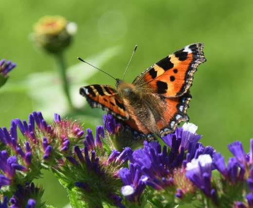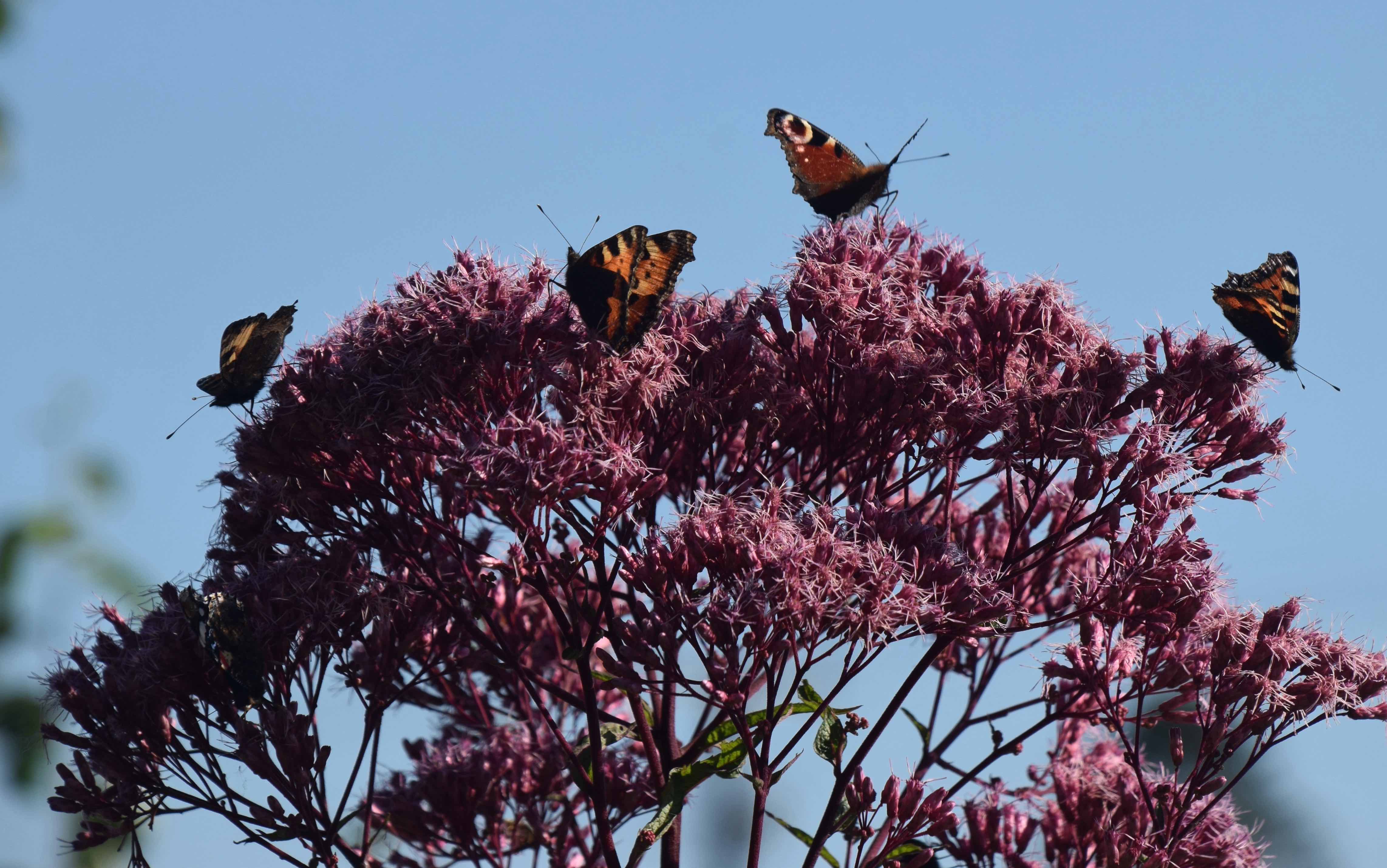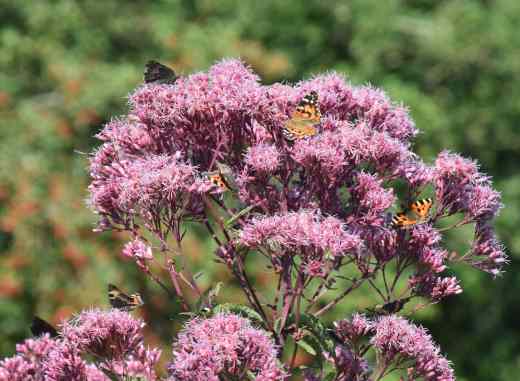 Eupatorium attracts a wide range – well as wide as I have in the garden – and at times there are all four of my common species, painted ladies (Vanessa cardui) – larvae feed on thistles, small tortoiseshells (Aglais urticae) – larvae feed on nettles (so do the nest two), red admiral (Vanessa atalanta) and peacocks (Aglais io). I do leave nettles to grow at the boundary of the garden and there are plenty of clumps nearby in hedges, though they unfortunately often get sprayed with herbicide in summer by the farmers. I have planted buckthorn in one of the new hedges to try to establish brimstones, but I guess that will take time.