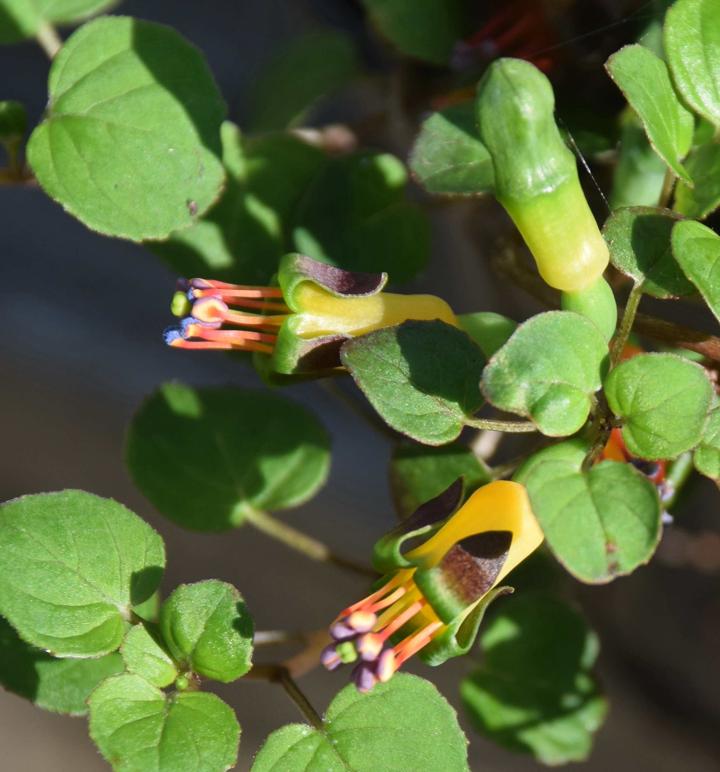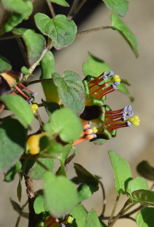 The flowers are small and are a strange mix of yellow, green, black with red stamens with blue pollen – mad! The flowers seem to be full of nectar but apparently the pollinators are not fully known. The flowers are also supposed to be of three kinds, either male, female or hermaphrodite but my flowers all appear to have a fully developed stigma and to have lots of blue pollen. Despite this I have not had any of the large, red berries which are much more showy than the flowers.