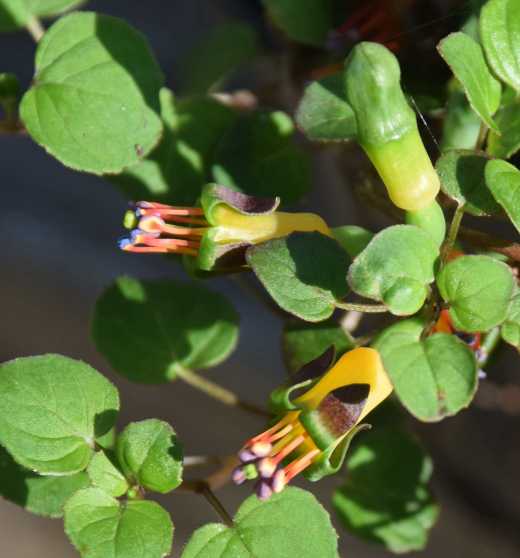 We all know what fuchsias look like. They are shrubby with opposite leaves. They have hanging flowers with four sepals and four petals and eight stamens – though these numbers will vary if the flowers are double. So why on earth have the botanists not meddled with Fuchsia procumbens and moved it into a different genus. For here we have a creeping plant with alternate leaves, flowers that face upwards and that have no petals. And I love it.