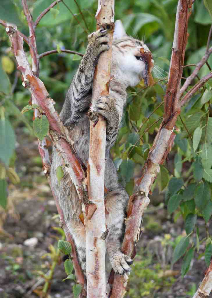 On a slightly more upbeat topic, I was removing some smaller branches on the birches now they are getting bigger, to shape them and to avoid removing large branches later, to expose and enhance the peeling bark. Mia helped. She has waited patiently for the trees to get big enough to climb and she decided that the peeling bark was annoying, fluttering in the wind, so she decided to leap up and pull it off.