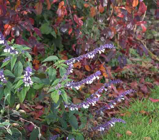 But relentless low-pressure systems barreling across the country mean not just wind and rain but the ameliorating effect of Atlantic winds and a freedom from frost. This has meant that late-flowering plants and tender perennials have continued to bloom and they give welcome and surprising splashes of colour here and there. Some of the tender salvias hardly pay their way in summer and I often wonder if they are worth the space but I am pleased to see them right now. They don’t always get the chance to look so good, if early autumn frosts cut them short, but this year they have succeeded in doing what they are capable of.