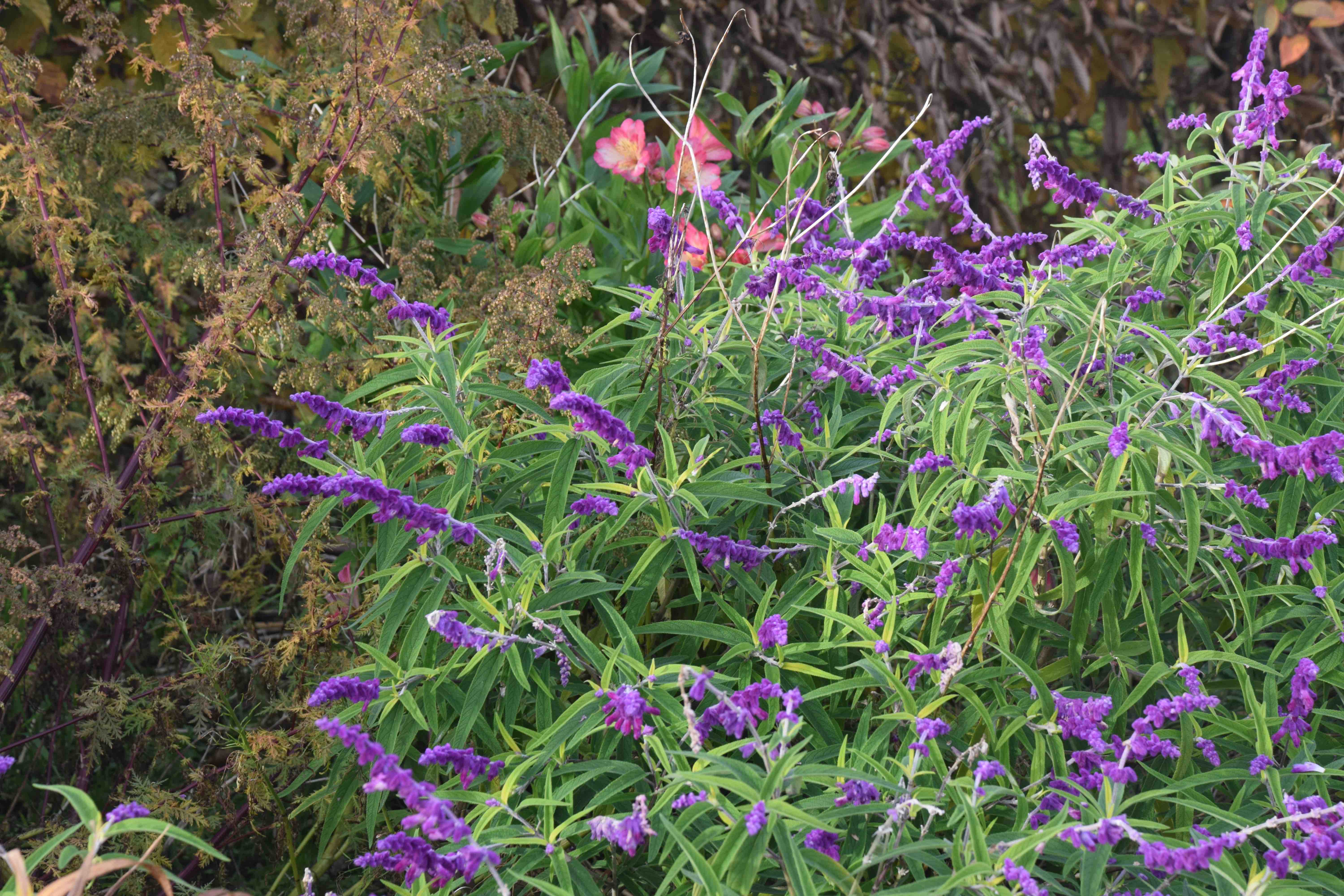 But relentless low-pressure systems barreling across the country mean not just wind and rain but the ameliorating effect of Atlantic winds and a freedom from frost. This has meant that late-flowering plants and tender perennials have continued to bloom and they give welcome and surprising splashes of colour here and there. Some of the tender salvias hardly pay their way in summer and I often wonder if they are worth the space but I am pleased to see them right now. They don’t always get the chance to look so good, if early autumn frosts cut them short, but this year they have succeeded in doing what they are capable of.
