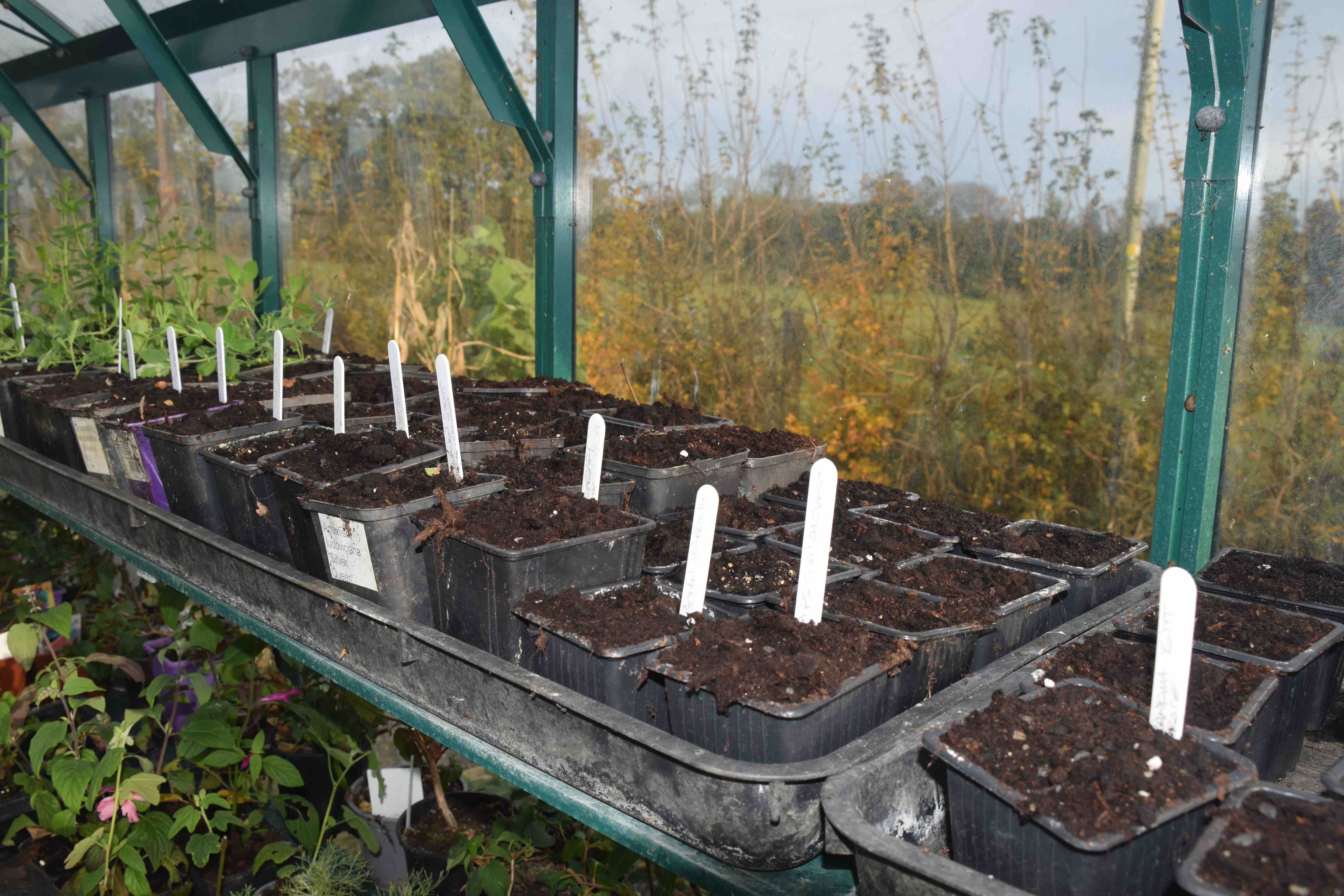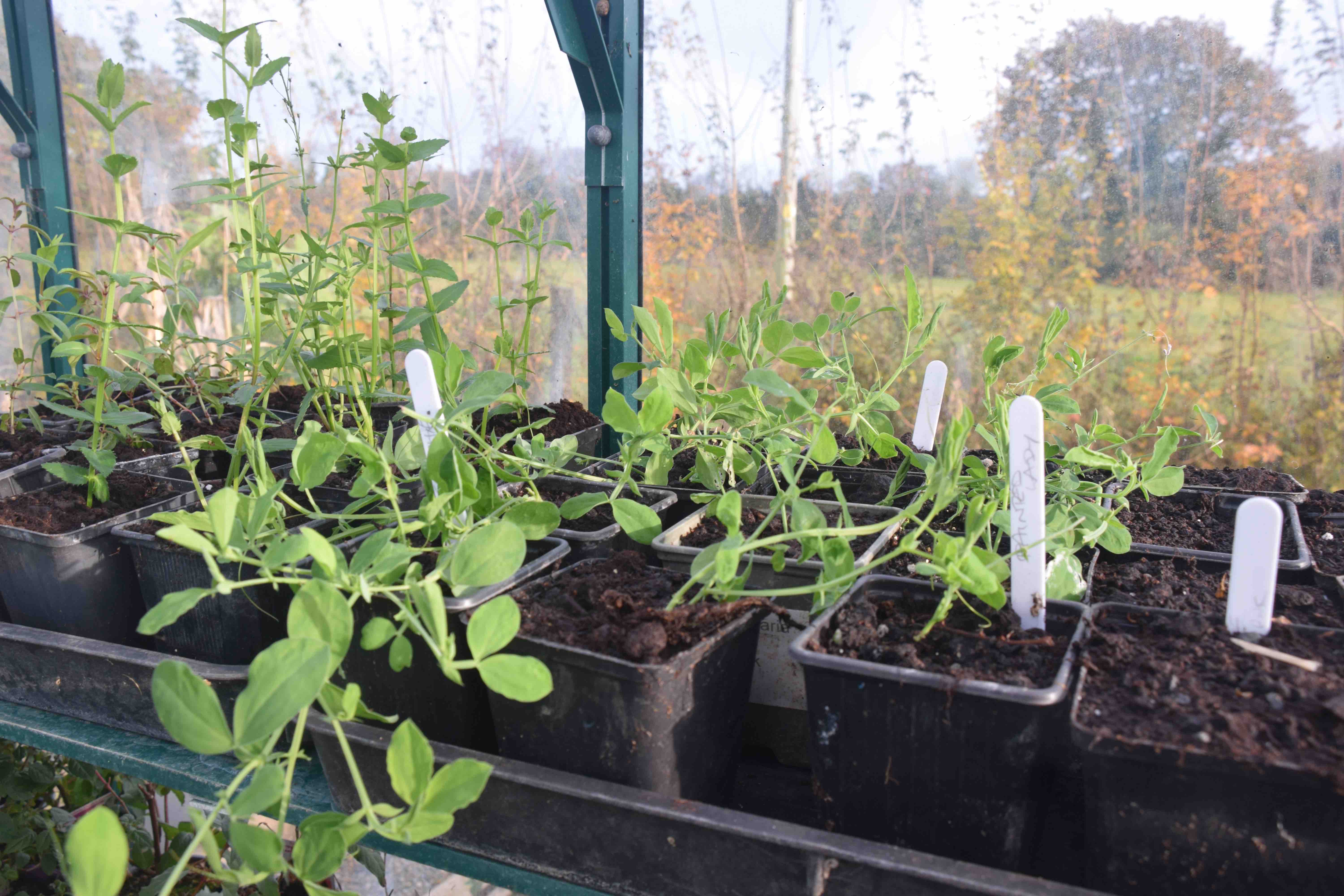 In the cold part of the greenhouse the sweet peas are sown. I half-heartedly grew them as cordons this summer and they were very popular for flowers sales at the gate so I have invested in some exhibition varieties for next summer with a wide colour range and chosen for scent. I am determined to grow them properly and have them sown. As usual, it was difficult to choose and I managed to narrow it down to 25 varieties. I have sown just 4 pots of each, hoping that I get three plants of each.