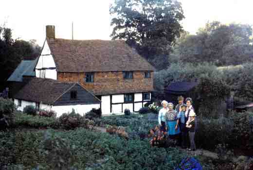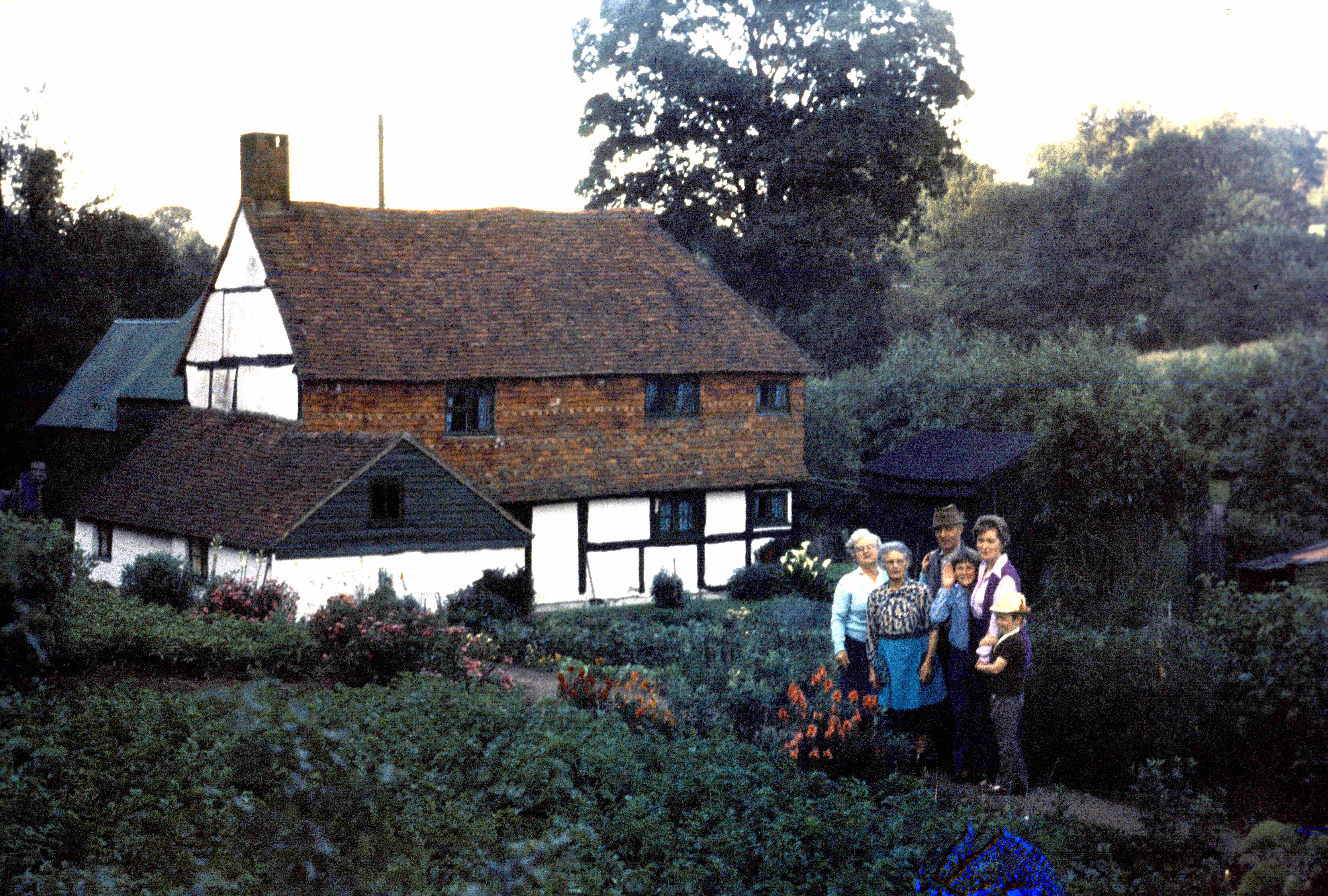 Nan, sister Carrie, mum, and Bert outside the cottage