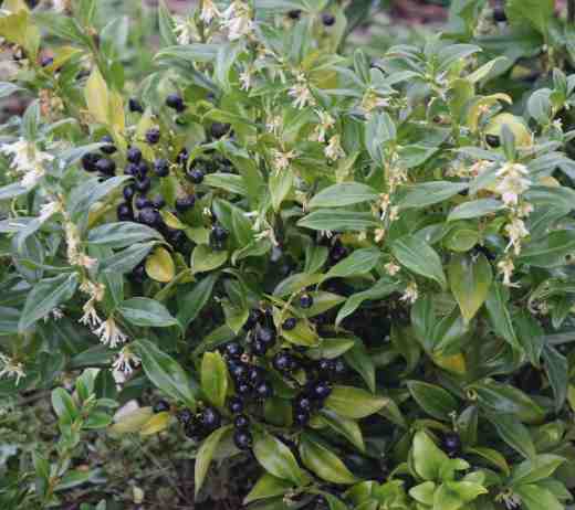 Sarcococcas are not visually very exciting, though they are neat and pleasant. But their perfume is amazing and it really does waft across the garden and lift the spirits. The contrast of the small white flowers and lustrous black berries is striking. The resident blackbirds seem to show no interest in the fruits, obviously not wanting to spoil their appetite for my redcurrants later in the season.