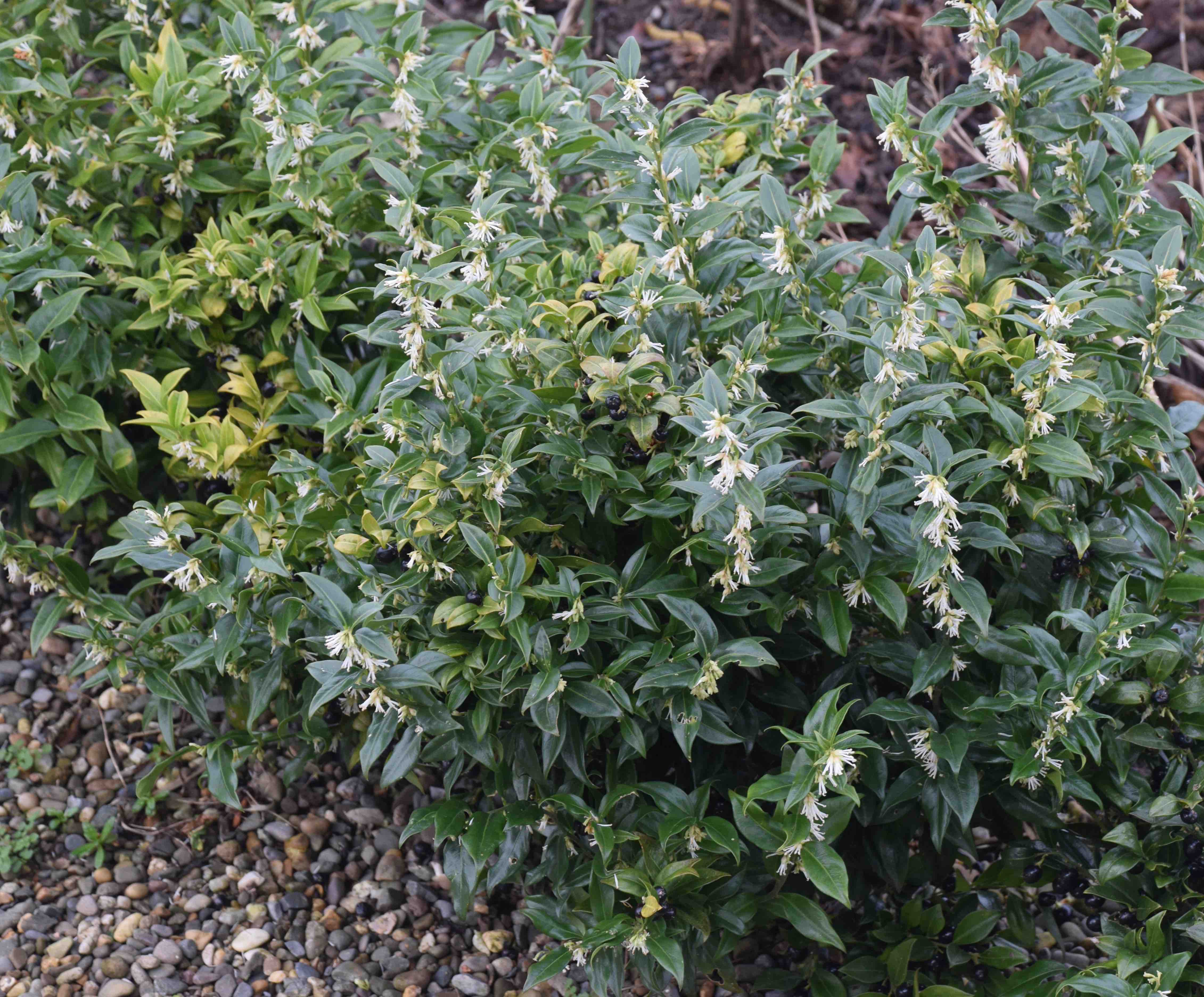 Sarcococcas are not visually very exciting, though they are neat and pleasant. But their perfume is amazing and it really does waft across the garden and lift the spirits. The contrast of the small white flowers and lustrous black berries is striking. The resident blackbirds seem to show no interest in the fruits, obviously not wanting to spoil their appetite for my redcurrants later in the season.