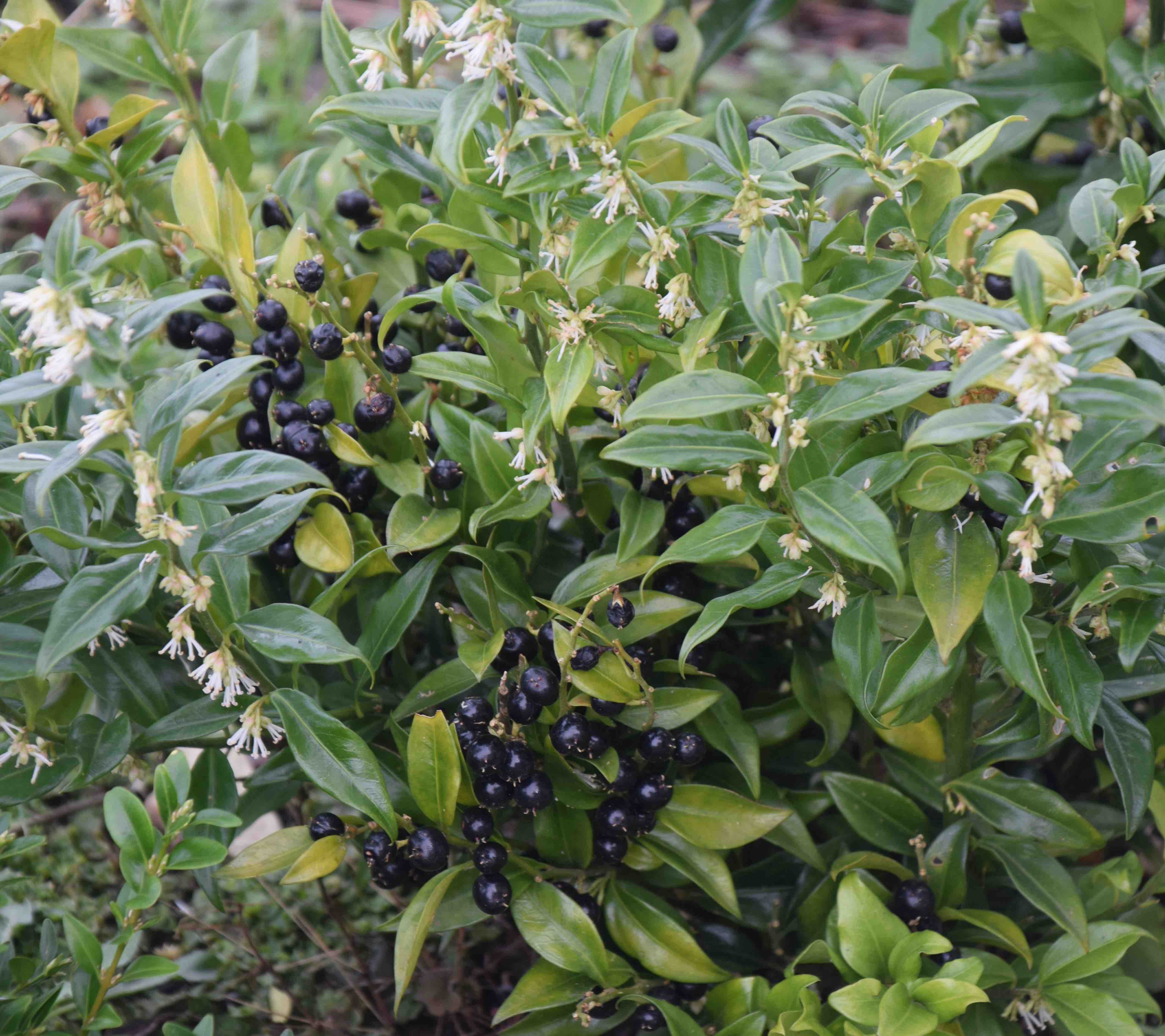 Some plants are reliable and always give pleasure. At the back of the house I planted a ‘ring’ of Sarcococca confusa. I raised lots of plants from seed – actually seedlings found under an old plant. It has not been wholly successful because the ground slopes and the lower area lays wet and sarcococcas dislike waterlogged conditions. Otherwise they are easy and thrive in shade. Mine will get more shade when the hazels above them fill out.