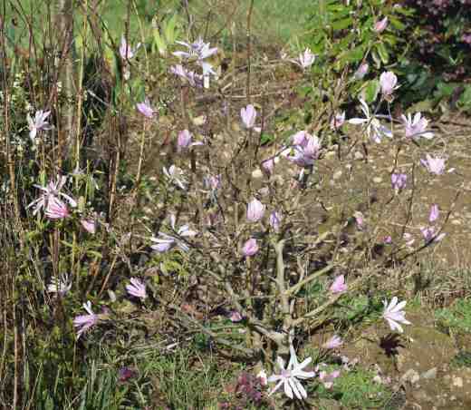 Most of the magnolias are showing no sign of flower, nor the camellias, but ‘Leonard Messel’ is covered in pink blossom.