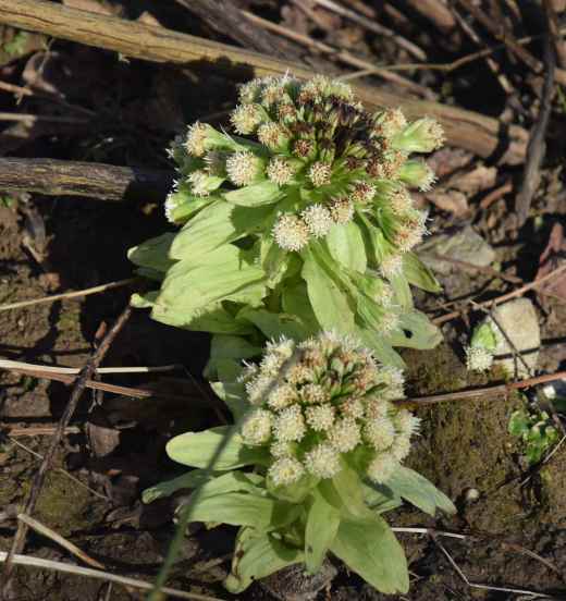 In a very different (wet) part of the garden Petasites japonicus ‘Giganteus’ is flowering. This is not a plant for small gardens and it is usually reliably invasive. So far it has behaved impeccably and only slowly spread. It has room to roam but has not yet taken advantage of the opportunity. The flower clusters always get frosted at the tips but the ‘cauliflower-like’ flowerhead are still attractive. When the leaves emerge they get munched by snails, which may be a clue to its limited growth.
